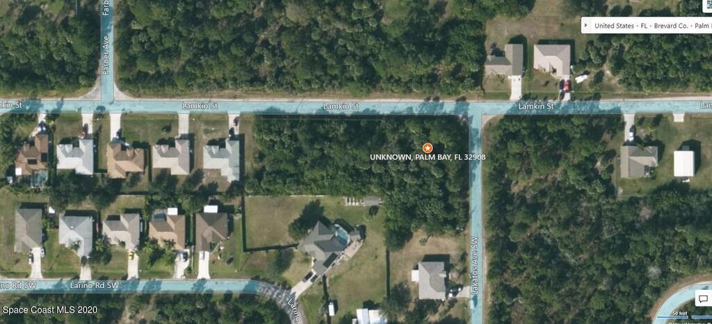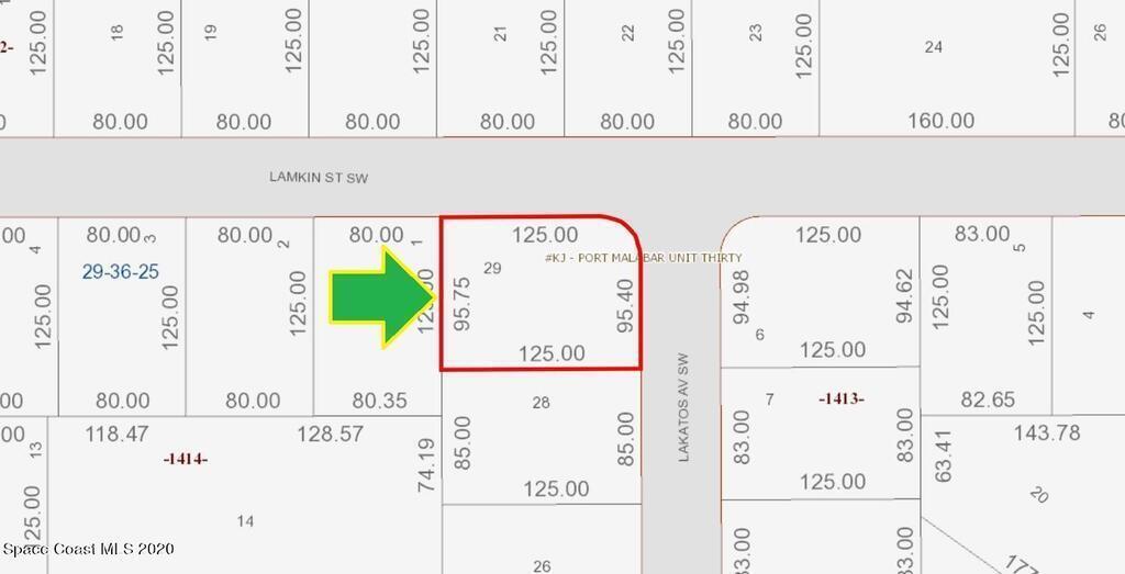 0,27 acre buildable residential lot available in Port Malabar Unit 30 of Palm Bay. Located in the southwest section, this Corner lot is just 1.9 miles - 5 minutes to Westside Elementary School, 3.9 miles - 8 minutes to the Publix Supermarket, 15.3 miles - 30 minutes to Melbourne Airport, and 17.7 miles - 34 minutes to the beaches of Indialantic. From exit #176 of I-95 go west on Palm Bay Road NE for .7 miles, left on Minton Road for 3.3 miles, right on Jupiter Boulevard for .1 mile, left on DeGroodt Road SW for 3.7 miles, right on Fitchburg Street for .5 miles, left on Farber Avenue for .4 miles, and left on Lamkin Street for .1 mile. The lot will be on your right on the southwest corner with Lakatos Avenue.