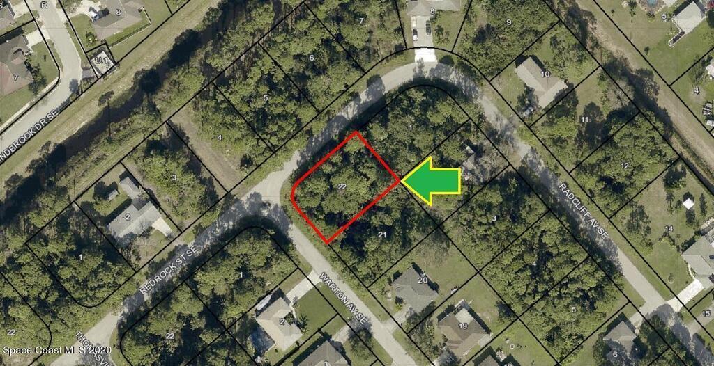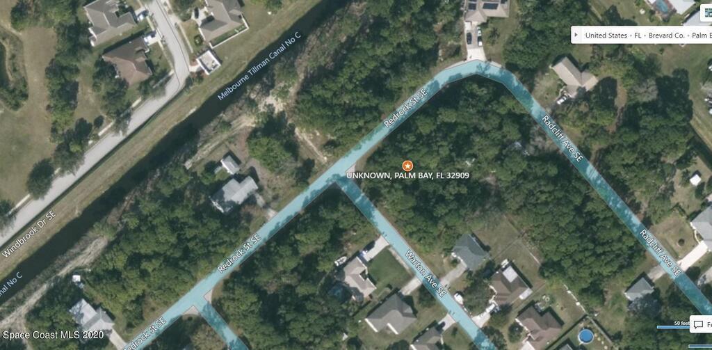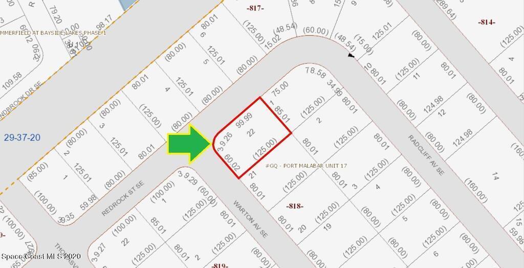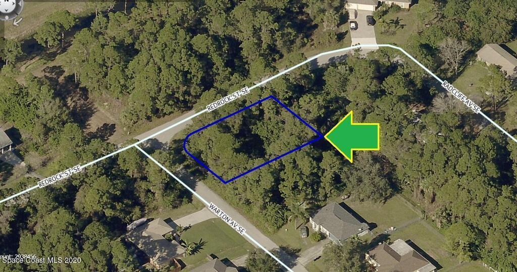 One of 2 side-by-side adjacent buildable residential lots available in Port Malabar Unit 17 of Palm Bay (the other is 1809 Warton). Located in the southeast section, this corner lot is just 1.7 miles - 5 minutes to the Publix Supermarket, 2.3 miles - 6 minutes to Columbia Elementary School, 12.3 miles - 27 minutes to Melbourne Airport, and 14.1 miles - 31 minutes to the beaches of Indialantic. From exit #173 of I-95 go west on Malabar Road NE for .2 miles, left on San Filippo Drive for .5 miles, right on Jupiter Boulevard for .9 miles, left on Emerson Drive for 2.1 miles, left on Walden Boulevard for .4 miles, right on Utah Street for .2 miles, right on Radcliff Avenue for .1 mile, road turns left and becomes Redrock Street, continue to corner with Warton on your left.