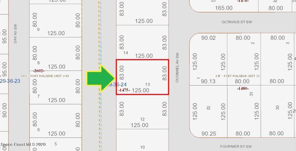 One of 2 side-by-side adjacent single family residential lots available in Port Malabar Unit #31 of Palm Bay (the other is 2180 O'Connel). Located in the southwest section, this .24 acre buildable residential lot has City Water available, a drainage canal in the rear allowing more privacy, and is just 1.3 miles - 4 minutes to Westside Elementary, 3.3 miles - 7 minutes to the Publix Supermarket, 14.7 miles - 33 minutes to Melbourne Airport, and 17.7 miles - 37 minutes to the beaches of Indialantic. From exit #176 of I-95 go west on Palm Bay Road NE for .7 miles, left on Minton Road for 3.3 miles, right on Jupiter Boulevard for .1 mile, left on DeGroodt Road for 3.3 miles, right on Osmosis Drive for .7 miles, and right on O'Connel Avenue. The lot will be on your left.
