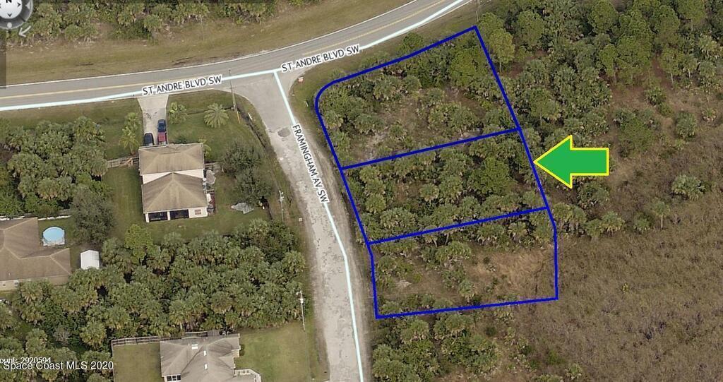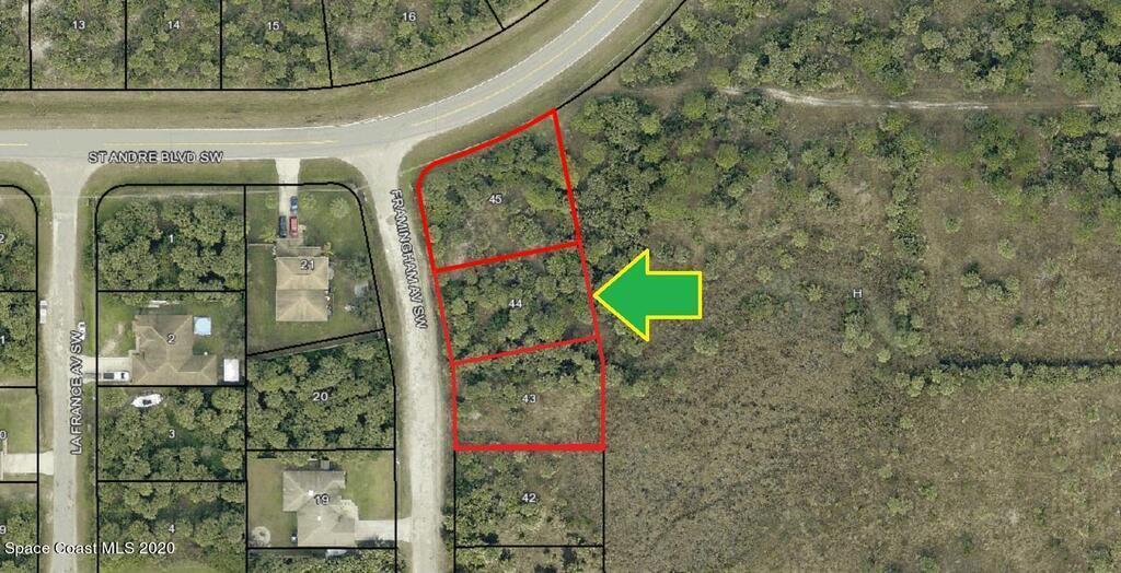 0.76 acres!!! Triple side-by-side adjacent single family residential lots available in Port Malabar Unit #30 of Palm Bay. Located in the southwest section, these buildable residential lots that include a Corner lot are just 2 miles - 4 minutes to Westside Elementary School, 3.9 miles - 8 minutes to the Publix Supermarket, 15.2 miles - 30 minutes to Melbourne Airport, and 17.1 miles - 32 minutes to the beaches of Indialantic. From exit #176 of I-95 go west on Palm Bay Road NE for .7 miles, left on Minton Road for 3.3 miles, right on Jupiter Boulevard for .1 mile, left on DeGroot Road SW for 4.6 miles, right on St. Andre Boulevard for .2 miles, and left on Framingham Avenue. The lot will be on your left. Buy all 3 for more room and privacy.