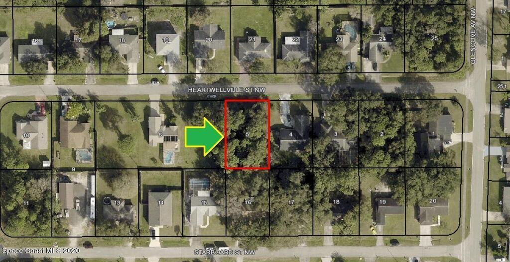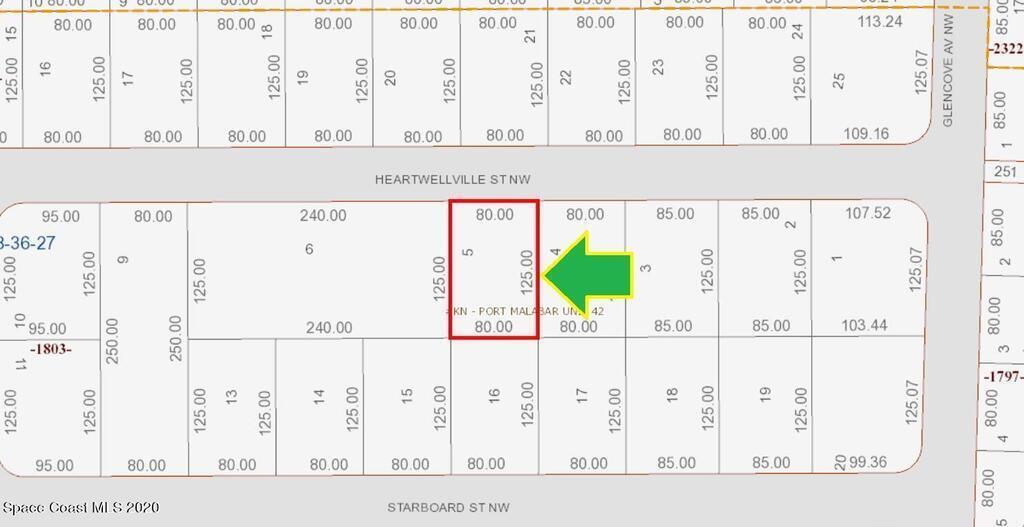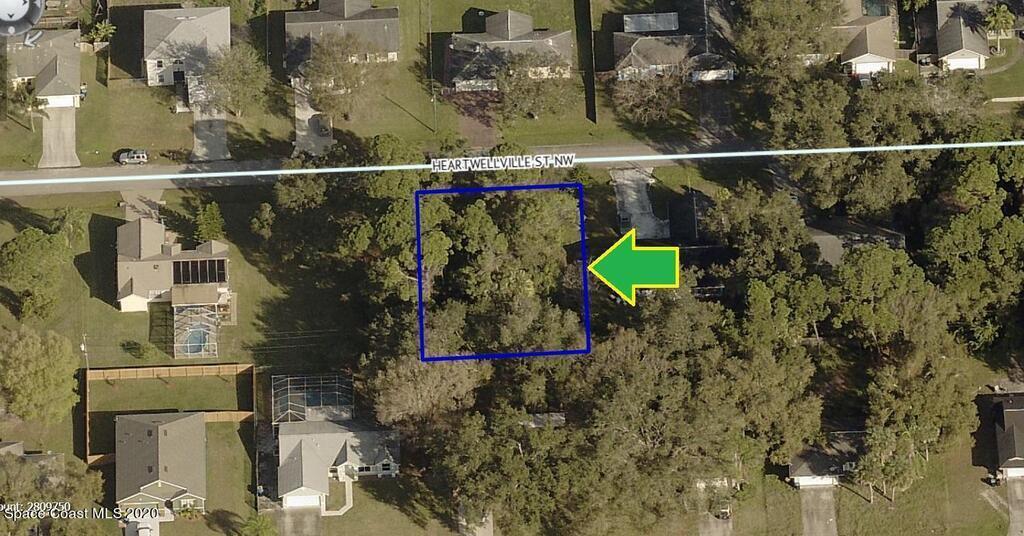 0.23 acre buildable residential lot available in Port Malabar Unit 42 of Palm Bay. Located in the northwest section, this lot has City Water available, and is just 1 mile - 3 minutes to Discovery Elementary School, 4 miles - 9 minutes to the Winn Dixie Supermarket, 10.9 miles - 23 minutes to Melbourne Airport, and 13.5 miles - 30 minutes to the beaches of Indialantic. From exit #180 of I-95 go west on US-192 for .5 miles, left on St. Johns Heritage Parkway for 3.8 miles, left on Emerson Drive NW for 1.4 miles, right on Glencove Avenue NW for .8 miles, and right on Heartwellville Street. The lot will be on your left.