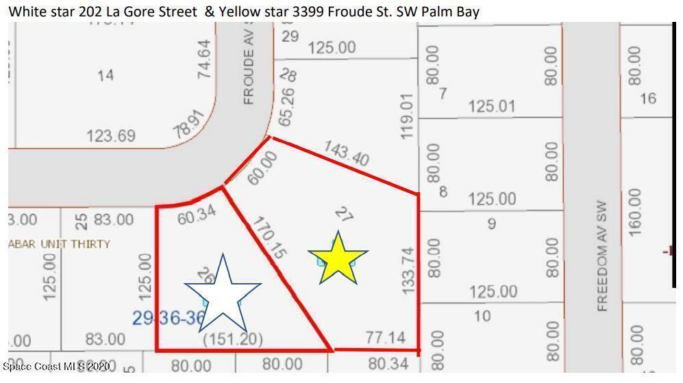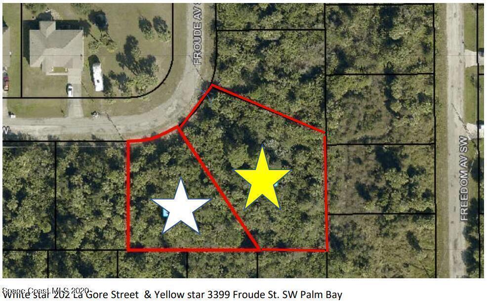 Loads of privacy and elbow-room for the home of your dreams on this RARE .75 acre side by side homesites in south Palm Bay. All-natural 202 La Gore Street SW ( .36 acre) combines with the adjacent 3399 Froude Ave. SW ( .39 acre) on an inside corner for this hard-to-find three-quarter-acre domain. The desirable property is in a no flood zone and has a clean, recently-prepared environmental report.