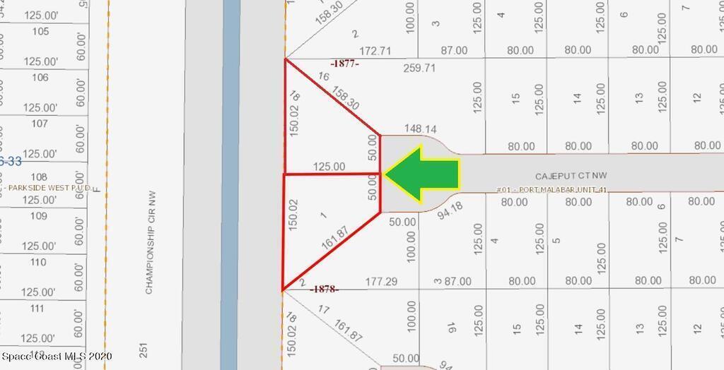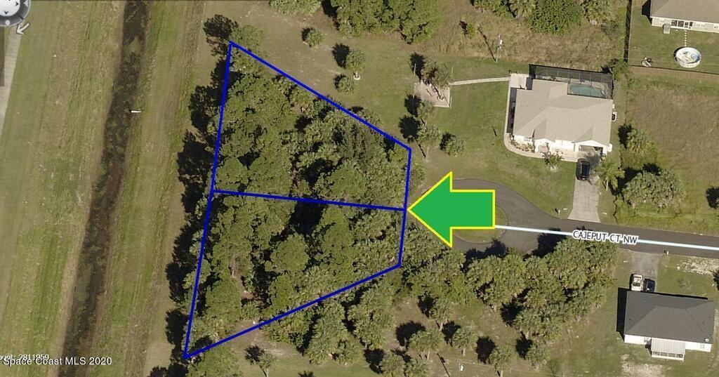 0.58 acres - 2 oversized side-by-side adjacent lots available in Port Malabar Unit 41 of Palm Bay. Located in the northwest section, this buildable residential lot has a drainage canal in the rear allowing more privacy, is in a cul-de-sac, and is just 1.7 miles - 5 minutes to Heritage High School, 3.5 miles - 8 minutes to the Winn Dixie Supermarket, 13.9 miles - 26 minutes to Melbourne Airport, and 16.5 miles - 33 minutes to the beaches of Indialantic. From exit #180 of I-95 go west on US-192 for .5 miles, left on St. John's Heritage Parkway for 6.1 miles, left on Malabar Road for .7 miles, left on Thunderbird Avenue for .2 miles, and left on Cajeput Court. The lot will be at the end of the cul-de-sac.
