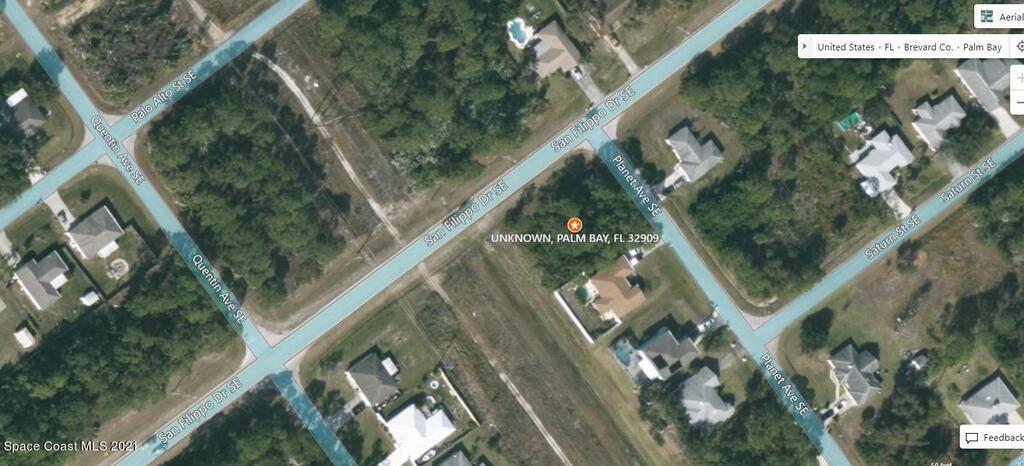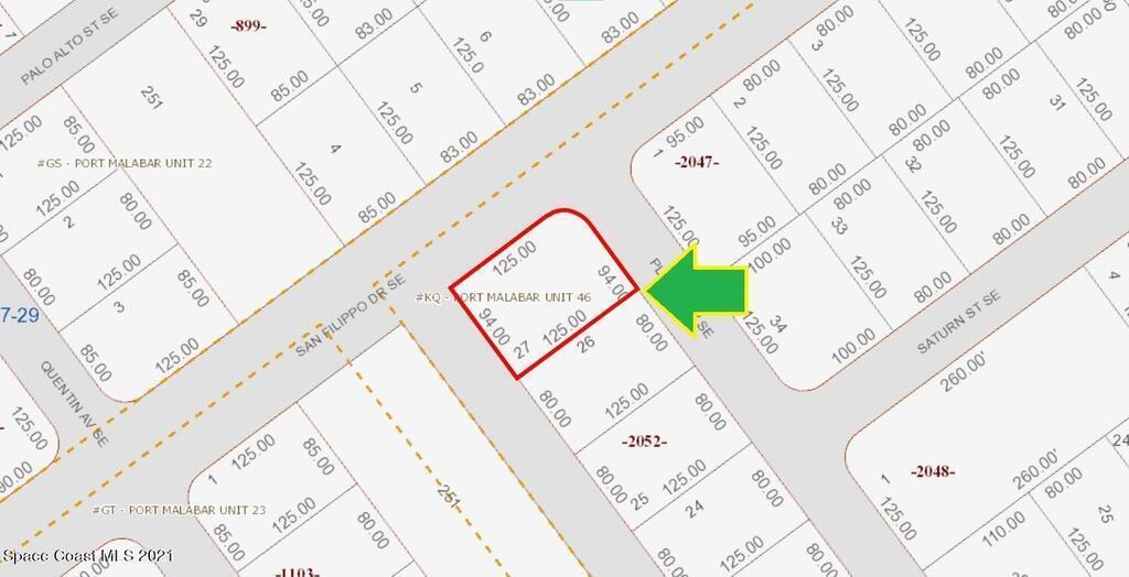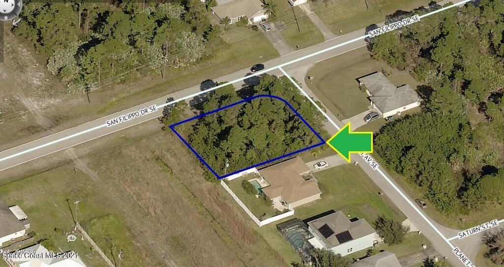 0.27 acre buildable residential lot available in Port Malabar Unit 46 of Palm Bay. Located in the southeast section, this corner lot has City Water available, a right-of-way easement in the rear allowing more privacy, and is just 3 miles - 6 minutes to the Publix Supermarket, 3.3 miles - 6 minutes to Sunrise Elementary School, 12.8 miles - 26 minutes to Melbourne Airport, and 14.6 miles - 30 minutes to the beaches of Indialantic. From exit #173 of I-95 go west on Malabar Road NE for .2 miles, left on San Filippo Drive SE for 5.4 miles, and left on Planet Avenue. The lot will be on your right at the corner with San Filippo.