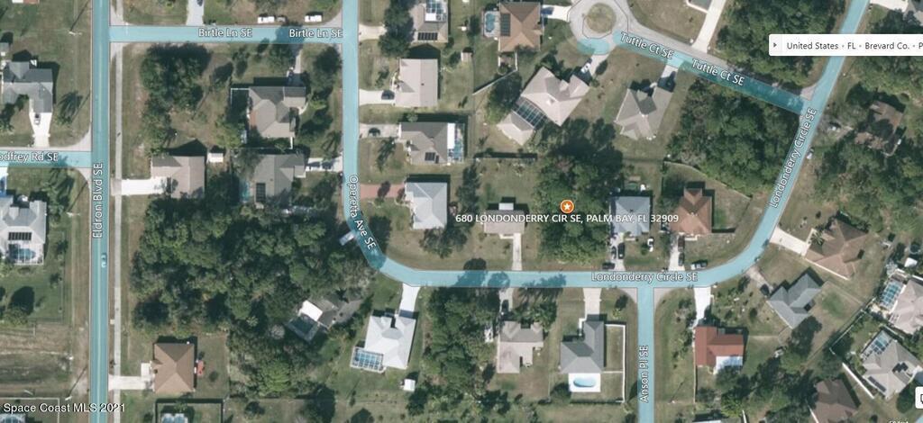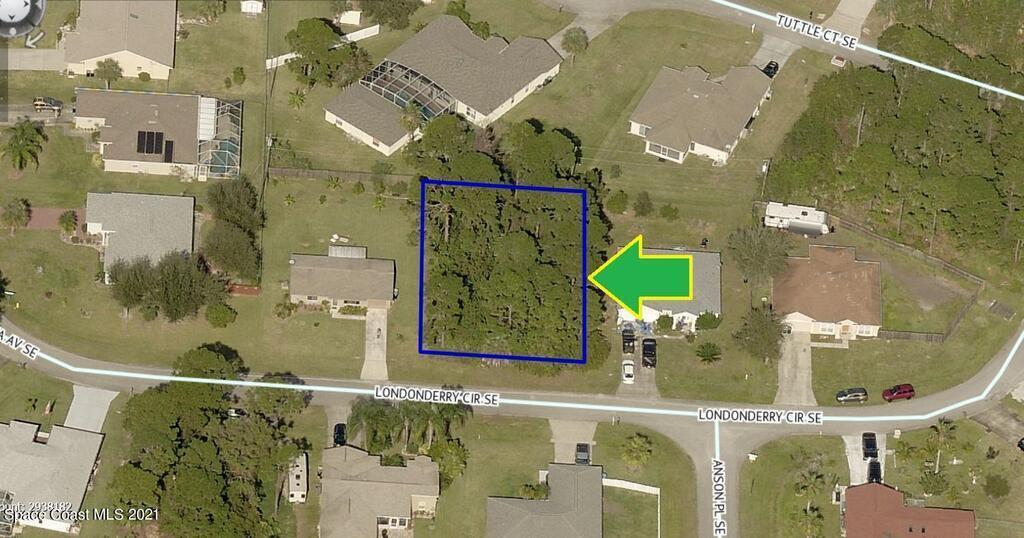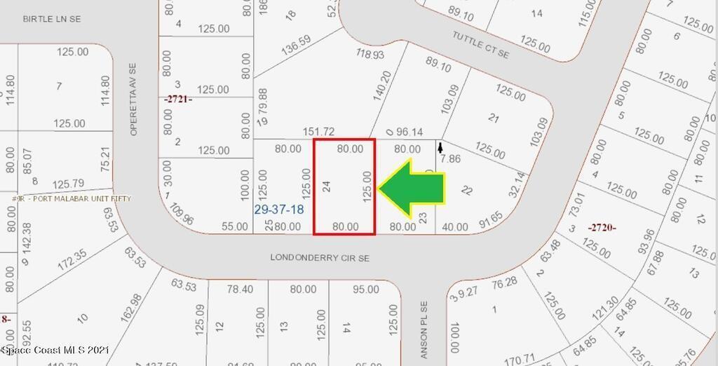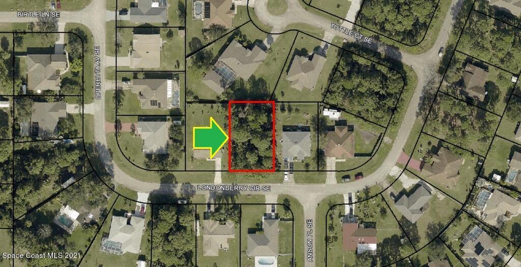 0.23 acre buildable residential lot available in Port Malabar Unit 50 of Palm Bay. Located in the southeast section, this lot has City Water available and is just .9 miles - 3 minutes to the Publix Supermarket, 2.4 miles - 6 minutes to Bayside High School, 13.1 miles - 27 minutes to Melbourne Airport, and 17.1 miles - 30 minutes to the beaches of Indialantic. From exit #173 of I-95 go west on Malabar Road NE for .2 miles, left on San Filippo Drive for .5 miles, right on Jupiter Boulevard SE for 1.7 miles, left on Eldron Boulevard SE for 1.9 miles, left on Birtle Lane for .1 mile, right on Operetta Avenue for .1 mile, road turns left and becomes Londonderry Circle. The lot will be on your left.
