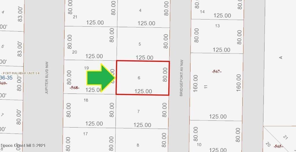 0.23 acre buildable residential lot available in Port Malabar Unit 14 of Palm Bay. Located in the northwest section, this lot has City Water available, and is just 2.1 miles - 6 minutes to the Winn Dixie Supermarket, 2.3 miles - 6 minutes to McAuliffe Elementary School, 10.7 miles - 23 minutes to Melbourne Airport, and 13.3 miles - 29 minutes to the beaches of Indialantic. From exit #176 of I-95 go west on Palm Bay Road NE for .7 miles, left on Minton Road for .2 miles, right on Emerson Drive NW for 1.5 miles, left on Jupiter Boulevard NW for 1.5 miles, left on Ivanhoe Street for .1 mile, and right on Bridgeport Avenue. The lot will be on your right.