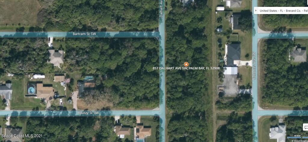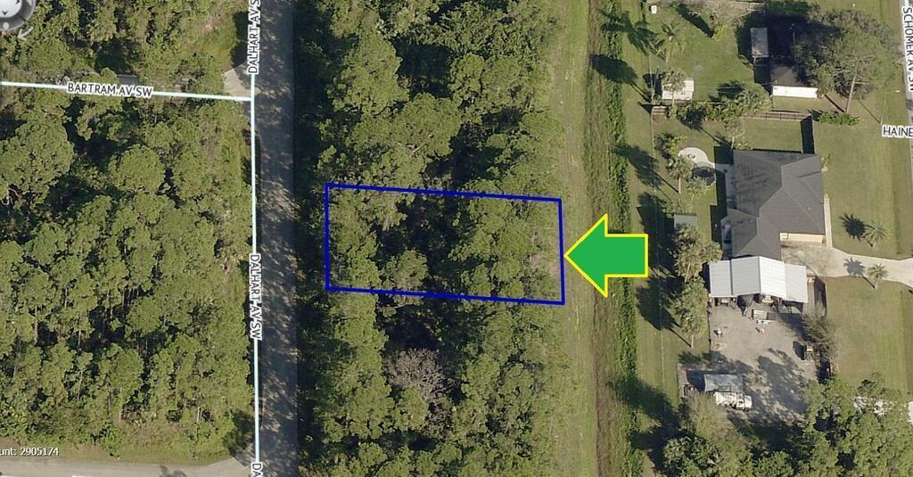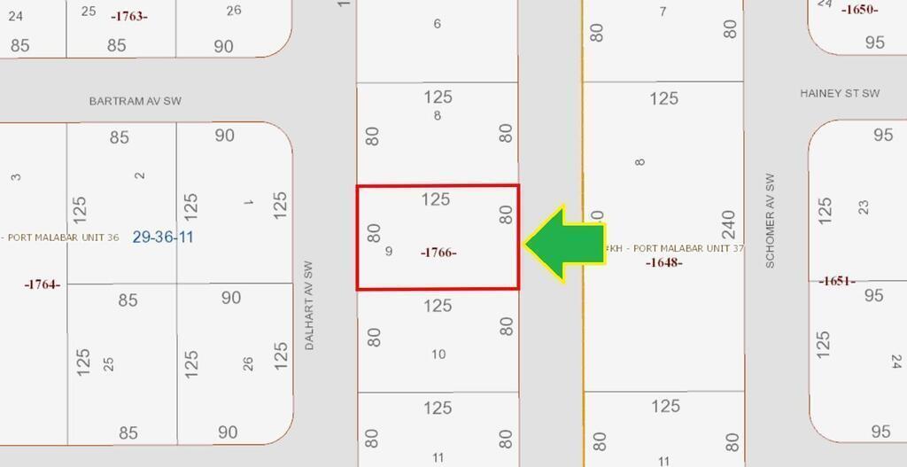 0.23 acre buildable residential lot available in Port Malabar Unit 36 of Palm Bay. Located in the southwest section, this lot has a drainage canal in the rear allowing more privacy, and is just 2 miles - 5 minutes to Jupiter Elementary School, 2.8 miles - 7 minutes to the Winn Dixie Supermarket, 12.6 miles - 27 minutes to Melbourne Airport, and 15.1 miles - 30 minutes to the beaches of Indialantic. From exit #176 of I-95 go west on Palm Bay Road NE for .7 miles, left on Minton Road for 2.5 miles, right on Malabar Road for 1 mile, left on Garvey Road for 1.3 miles, right on Harper Boulevard SW for .5 miles, and left on Dalhart Avenue. The lot will be on your left.