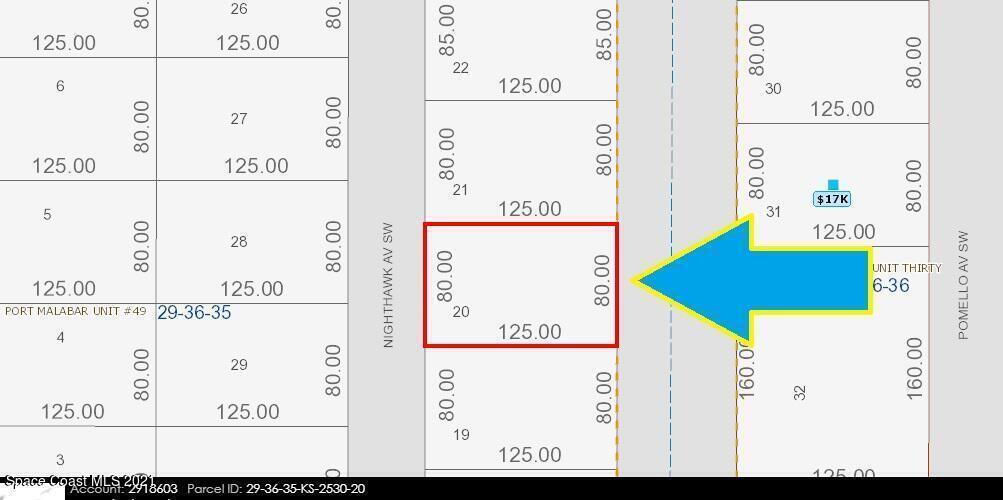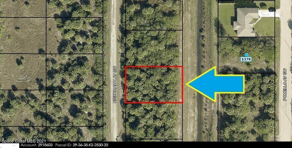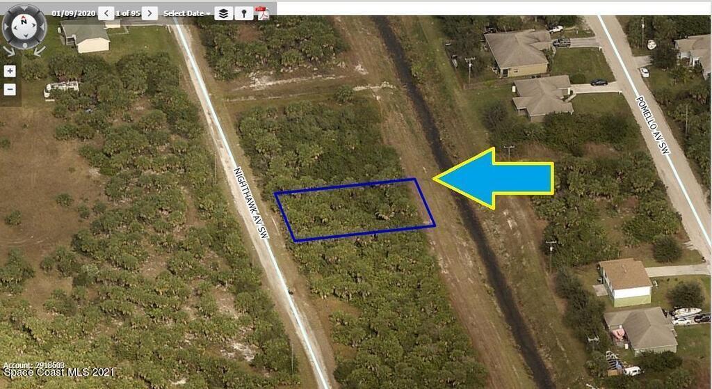 0.23 acre buildable residential lot available in Port Malabar Unit 49 of Palm Bay. Located in the southwest section, this lot has a drainage canal in the rear allowing more privacy, and is just 3.3 miles - 7 minutes to Westside Elementary School, 5.3 miles - 11 minutes to the Publix Supermarket, 16.5 miles - 31 minutes to Melbourne Airport, and 18.4 miles - 34 minutes to the beaches of Indialantic. From exit #176 of I-95 go west on Palm Bay Road for .7 miles, left on Minton Road for 3.3 miles, right on Jupiter Boulevard for .1 mile, left on DeGroodt Road SW for 4.6 miles, right on St. Andre Boulevard for 1.1 mile, left on Moss Terrace for .1 mile, road turns right and becomes Nighthawk Avenue. The lot will be on your left.