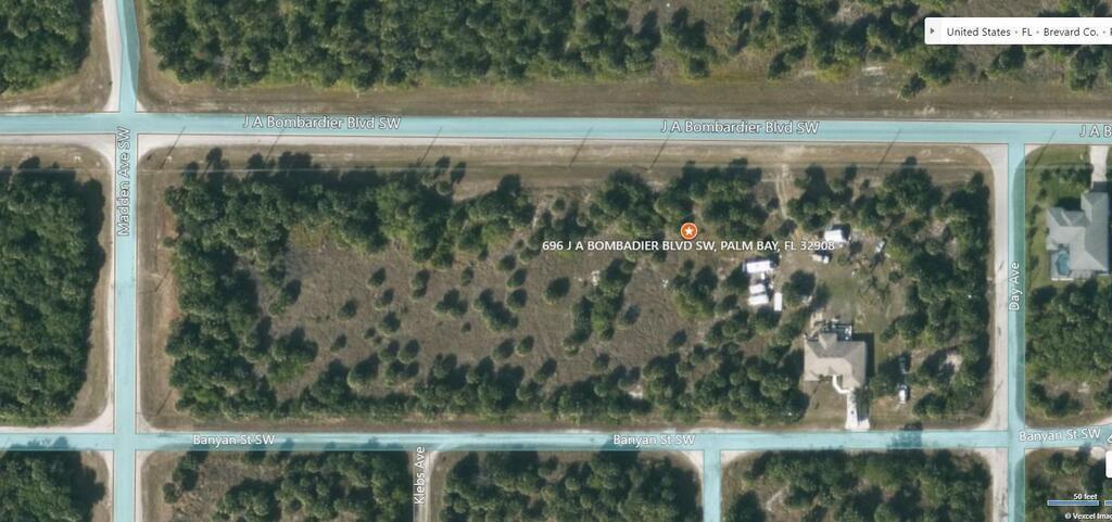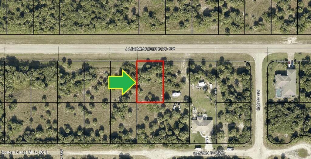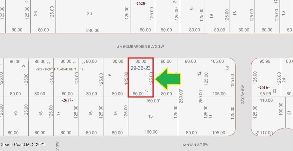 0.23 acre buildable residential lot available in Port Malabar Unit 49 of Palm Bay. Located in the southwest section, this lot is just 1 mile - 3 minutes to Bayside High School, 2.3 miles - 6 minutes to the Publix Supermarket, 13.9 miles - 29 minutes to Melbourne Airport, and 16.7 miles - 35 minutes to the beaches of Indialantic. From exit #176 of I-95 go west on Palm Bay Road for .7 miles, left on Minton Road for 3.3 miles, right on Jupiter Boulevard for .1 mile, left on DeGroodt Road SW for 2.5 miles, and right on J.A.Bombardier Boulevard for .8 miles. The lot will be on your left.