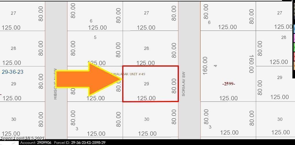 0.23 acre build-able single family residential lot [Rs2 Zoning and power line at the street!) available in Port Malabar Unit #49 of Palm Bay. Located in the southwest section near the Compound, this lot is just about 4 minutes to Bayside High School, 7 minutes to Publix Supermarket, 30 minutes to Melbourne International Airport, 33 minutes to the beaches of Indialantic. From exit #176 of I-95 go west on Palm Bay Road NE for .7 miles, left on Minton Road for 3.3 miles, right on Jupiter Boulevard SW for .1 mile, left on DeGroodt Road SW. Proceed south for 3.3 miles and turn right on Osmosis Drive. Proceed 1 mile and turn right on Madden Avenue, left on Talton Drive SW and right on Soria Avenue. The lot is on the left.