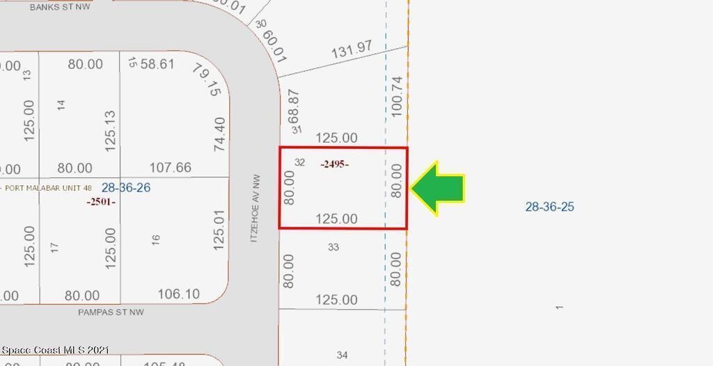 0.23 acre buildable residential lot available in Port Malabar Unit 48 of Palm Bay. Located in the northwest section, this lot has city water available, and is just 2.5 miles - 6 minutes to Discovery Elementary School, 2.9 miles - 7 minutes to the Publix Supermarket, 9.5 miles - 21 minutes to Melbourne Airport, and 12.4 mile - 27 minutes to the beaches of Indialantic. From exit #176 of I-95 go west on Palm Bay Road NE for .7 miles, left on Minton Road for .2 miles, right on Emerson Drive NW for 1.5 miles, left on Jupiter Boulevard for .3 miles, left on Banks Street for .5 miles, road turns right and becomes Itzehoe Avenue. The lot will be on your left.