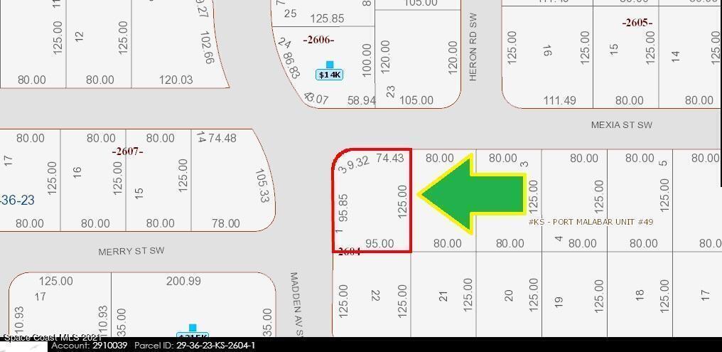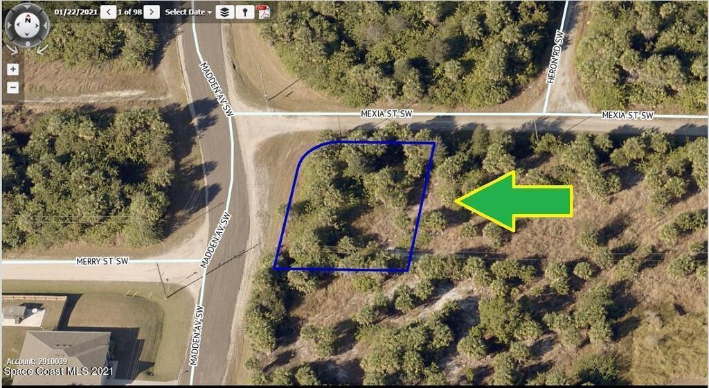 0.27 acre buildable residential lot available in Port Malabar Unit 49 of Palm Bay. Located in the southwest section, this corner lot is just 1.6 miles - 4 minutes to Bayside High School, 2.8 miles - 7 minutes to the Publix Supermarket, 14.3 miles - 31 minutes to Melbourne Airport, and 17.3 miles - 36 minutes to the beaches of Indialantic. From exit #176 of I-95 go west on Palm Bay Road NE for .7 miles, left on Minton Road for 3.3 miles, right on Jupiter Boulevard for .1 mile, left on DeGroodt Road SW for 2.5 miles, right on JA Bombardier Boulevard for .9 miles, left on Madden Avenue for .4 miles and left on Mexia Street. The lot is on the southeast corner with Madden Avenue.
