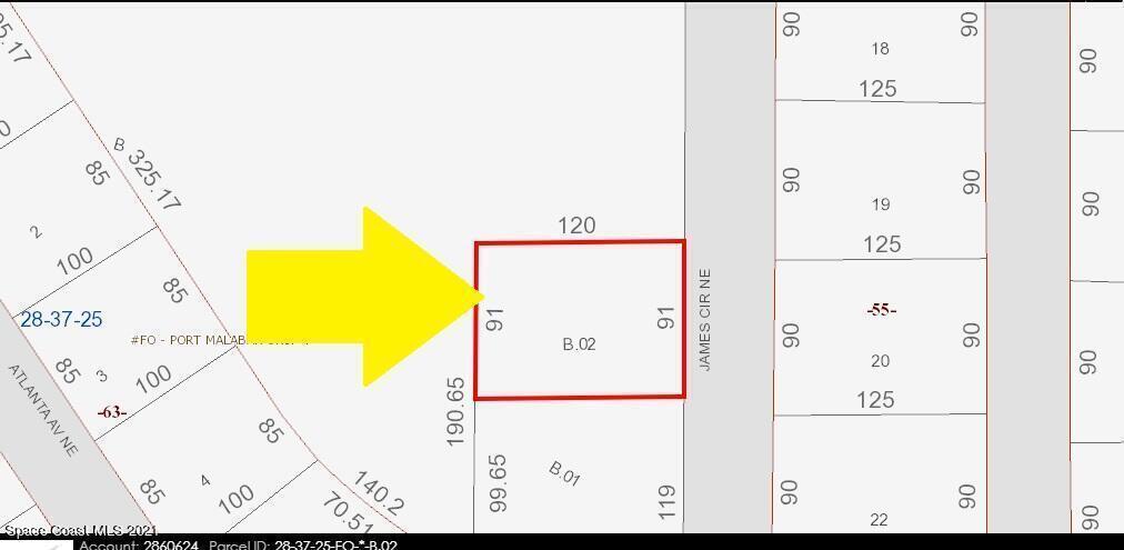 0.25 acre buildable residential lot available in Port Malabar Unit 4 of Palm Bay. Located in the northeast section, this lot has city water and sewer available, and is just 2.3 miles - 7 minutes to Palm Bay Elementary School, 3.6 miles - 8 minutes to the Publix Supermarket, 8.2 miles - 15 minutes to the beaches of Indialantic, and 8.2 miles - 17 minutes to Melbourne Airport. From exit #176 of I-95 go east on Palm Bay Road NE for 3.3 miles, right on Clearmont Street for 1.4 miles, left on Port Malabar Boulevard for ,8 miles, right on Bianca Drive NE for .3 miles, and left on James Circle. The lot will be on your left.
