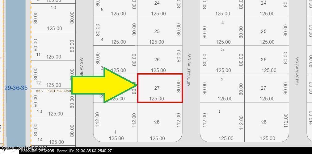 0.23 acre buildable residential lot available in Port Malabar Unit 49 of Palm Bay. Located in the southwest section, this lot is just 3.3 miles - 7 minutes to Westside Elementary School, 5.2 miles - 10 minutes to the Publix Supermarket, 16.5 miles - 34 minutes to Melbourne Airport, and 18.4 miles - 37 minutes to the beaches of Indialantic. From exit #176 of I-95 go west on Palm Bay Road NE for .7 miles, left on Minton Road for 3.3 miles, right on Jupiter Boulevard for .1 mile, left on DeGroodt Road for 4.6 miles, right on St. Andre Boulevard for 1.3 miles, and left on Metcalf Avenue. The lot will be on your right.