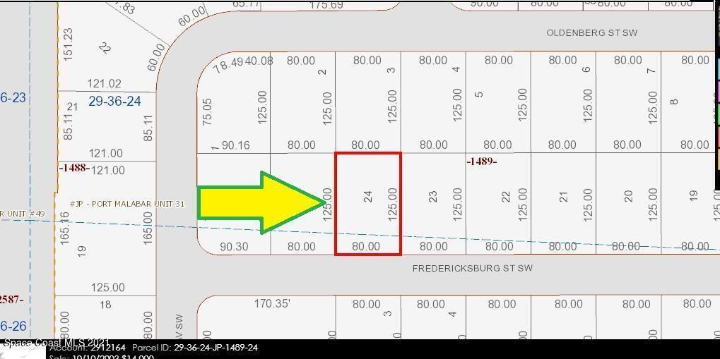 0.23 acre buildable residential lot available in Port Malabar Unit 31 of Palm Bay. Located in the southwest section, this lot has city water available and is just 1.3 miles - 4 minutes to Westside Elementary School, 3,2 miles - 8 minutes to the Publix Supermarket, 14.8 miles - 31 minutes to Melbourne Airport, and 17.5 miles - 37 minutes to the beaches of Indialantic. From exit #176 of I-95 go west on Palm Bay Road NE for .7 miles, left on Minton Road for 3.3 miles, right on Jupiter Boulevard for .1 mile, left on DeGroodt Road for 3.3 miles, right on Osmosis Drive for .7 miles, left on Garland Drive for .1 mile, right on Oldenberg Street for .1 mile, road turns left and becomes Fleming Ave,, and turn left on Fredericksburg Street. The lot will be on your left.