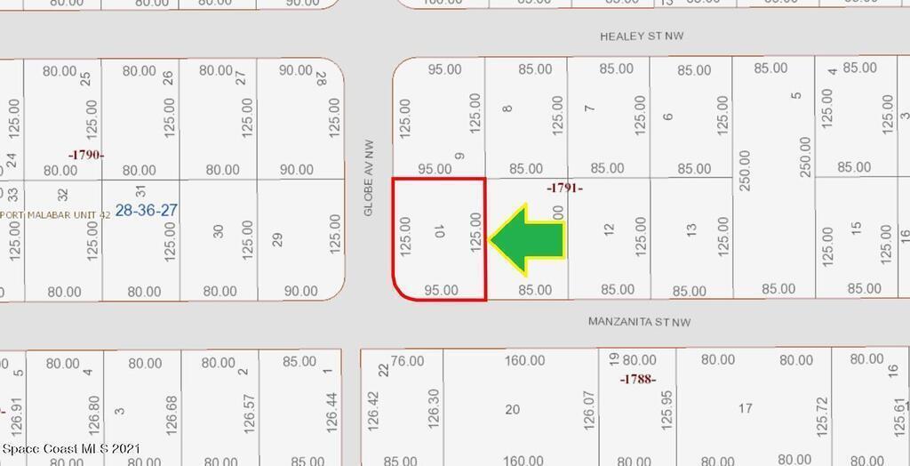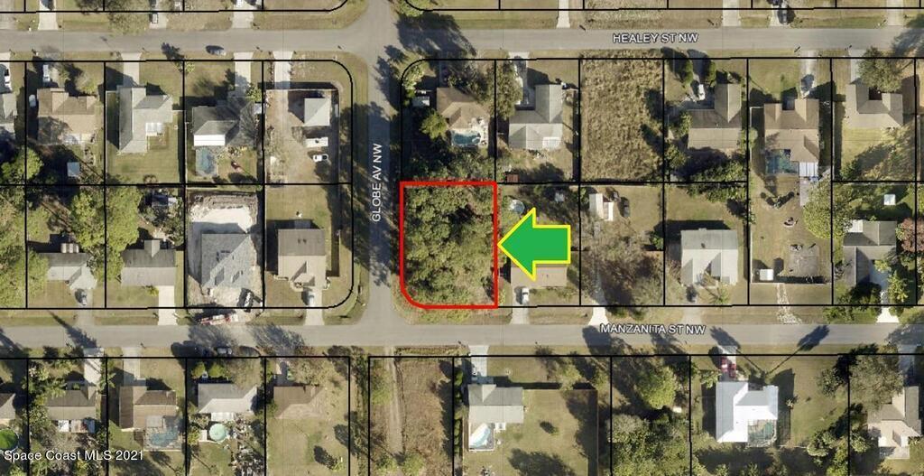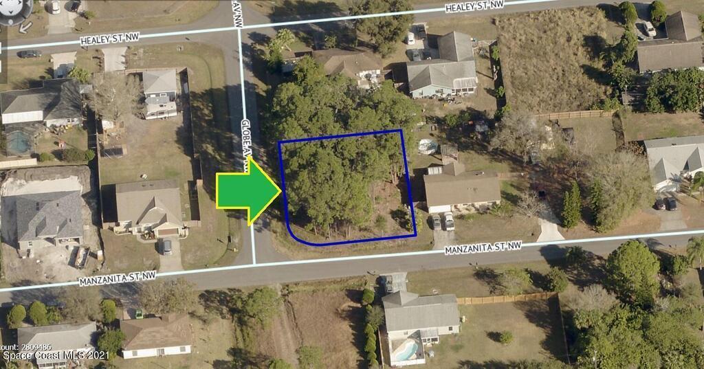 0.24 acre buildable residential lot available in Port Malabar Unit 42 of Palm Bay. Located in the northwest section, this Corner lot has City Water available and is just 1.3 miles - 5 minutes to Discovery Elementary School, 4 miles - 9 minutes to the Winn Dixie Supermarket, 13.3 miles - 24 minutes to Melbourne Airport, and 14.8 miles - 32 minutes to the beaches of Indialantic. From exit #180 of I-95 go west on US-192 for .5 miles, left on St Johns Heritage Parkway for 4.8 miles, left on Pace Drive NW for 1 mile, right on Glendale Avenue for .2 miles, road turns left and becomes Manzanita Street. The lot will be on your left on the northeast corner with Globe Avenue.