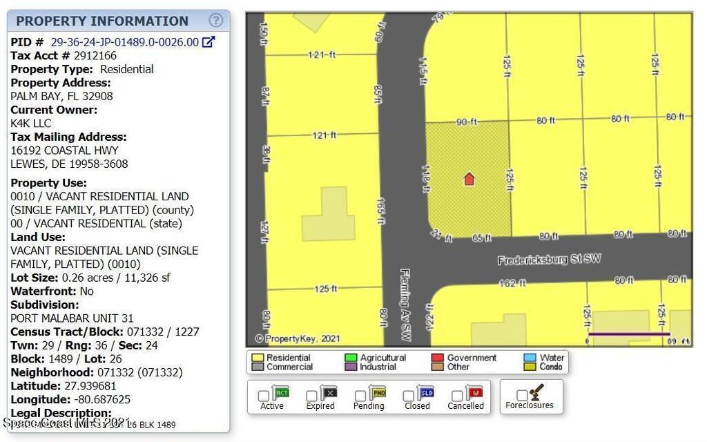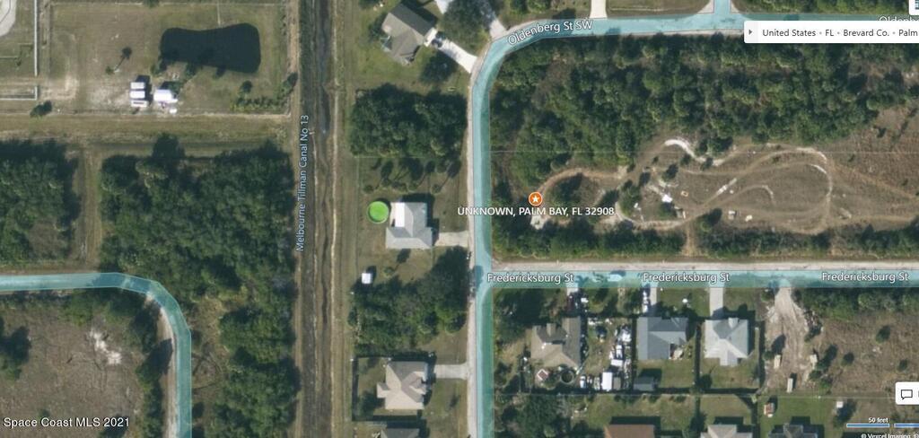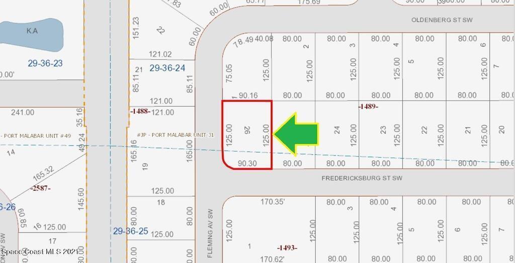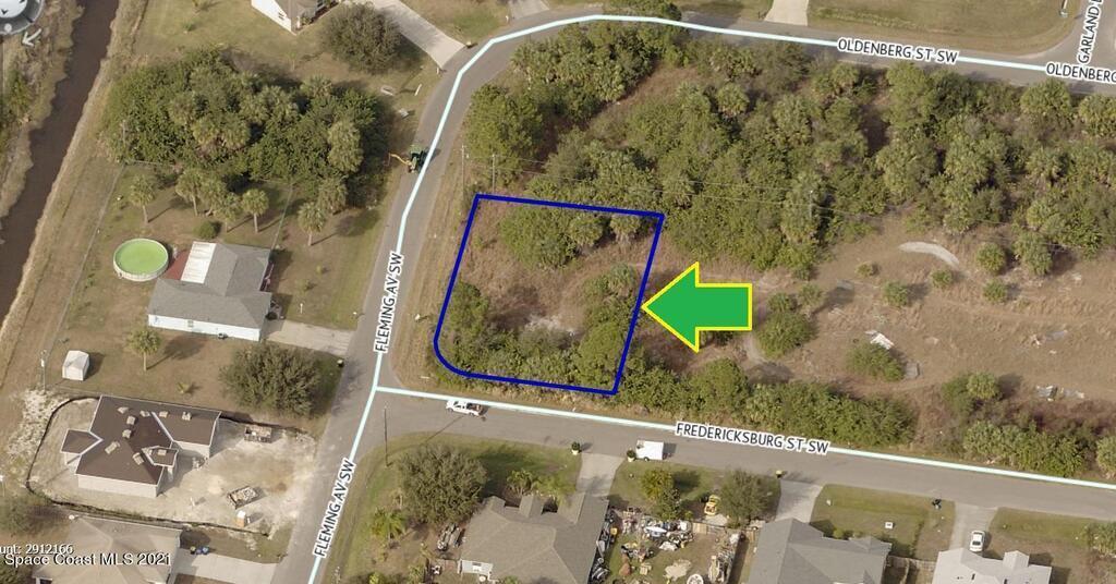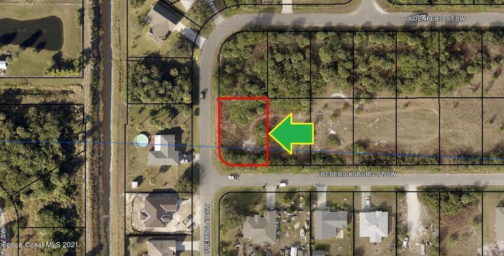 0.26 acre buildable residential Corner lot available in Port Malabar Unit 31 of Palm Bay. Located in the southwest section, this lot has city water available and is just 1.3 miles - 4 minutes to Westside Elementary School, 3.2 miles - 8 minutes to the Publix Supermarket, 14.8 miles - 30 minutes to Melbourne Airport, and 17.5 miles - 36 minutes to the beaches of Indialantic. From exit #176 of I-95 go west on Palm Bay Road NE for .7 miles, left on Minton Road for 3.3 miles, right on Jupiter Boulevard for .1 mile, left on DeGroodt Road for 3.3 miles, right on Osmosis Drive for .7 miles, left on Garland Dr. for .1 mile, right on Oldenberg St., left on Fleming Avenue, and left on Fredericksburg. The lot will be on your left on the corner with Fleming.