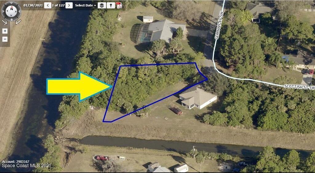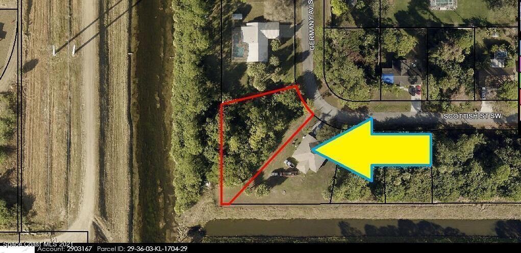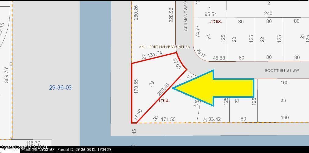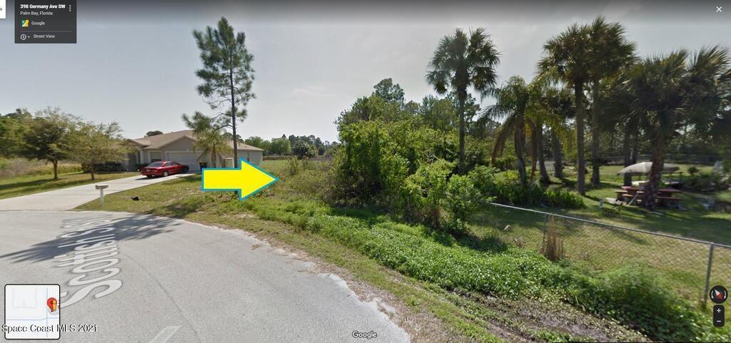 Oversized 0.45 acre [just under 1/2 acre] buildable single family residential lot [Rs2 Zoning] with a right-of-way easement canal in the back of the property available in Port Malabar Unit #36 of Palm Bay. Nicely located in the SW Section., this lot with mega-room is just 5.2 miles -13 minutes- to Publix Shopping & the Walmart SuperCenter & the I-95 ramp, 1.3 miles -5 minutes- to Jupiter Elementary, 9.7 miles -22 minutes- to the Melbourne Square Mall, and just 34 minutes to the beaches in Indialantic. From Exit #176 of I-95 go west on Palm Bay Road NE. Turn left on Minton Road and proceed south for 2.5 miles. Turn right on Malabar Road and proceed west for 2.2 miles. Turn left on Hurley Boulevard SW & right on Scottish Street SW. Proceed to 398 Germany Avenue SW. The lot will be left.