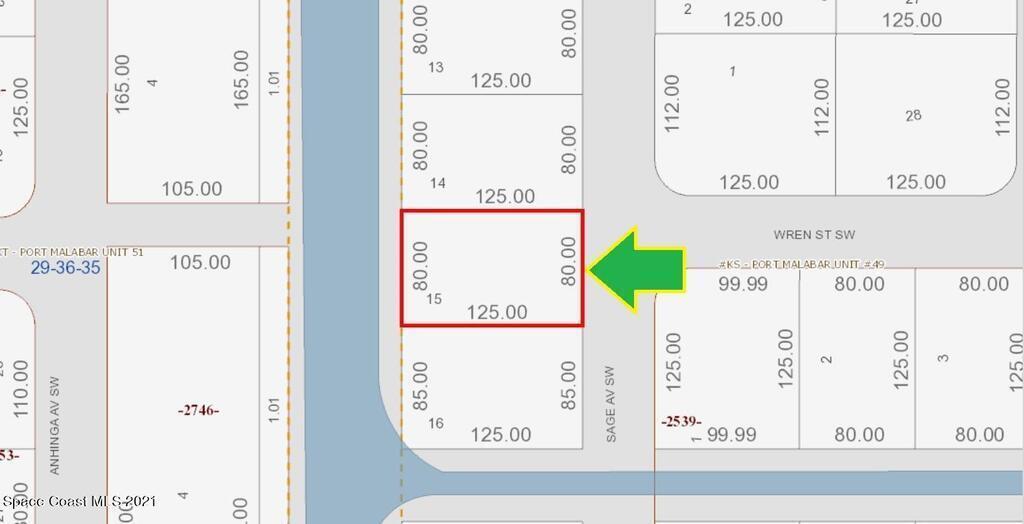 0.23 acre buildable residential lot available in Port Malabar Unit 49 of Palm Bay. Located in the southwest section, this lot has a drainage canal in the rear allowing more privacy, and is just 3.4 miles - 7 minutes to Westside Elementary School, 5.3 miles - 11 minutes to the Publix Supermarket, 16.6 miles - 34 minutes to Melbourne Airport, and 21.3 miles - 36 minutes to the beaches of Indialantic. From exit #176 of I-95 go west on Palm Bay Road for .7 miles, left on Minton Road for 3.3 miles, right on Jupiter Boulevard for .1 mile, left on DeGroodt Road for 4.6 miles, right on St. Andre Boulevard for 1.4 miles, and left on Sage Avenue. The lot will be on your right.