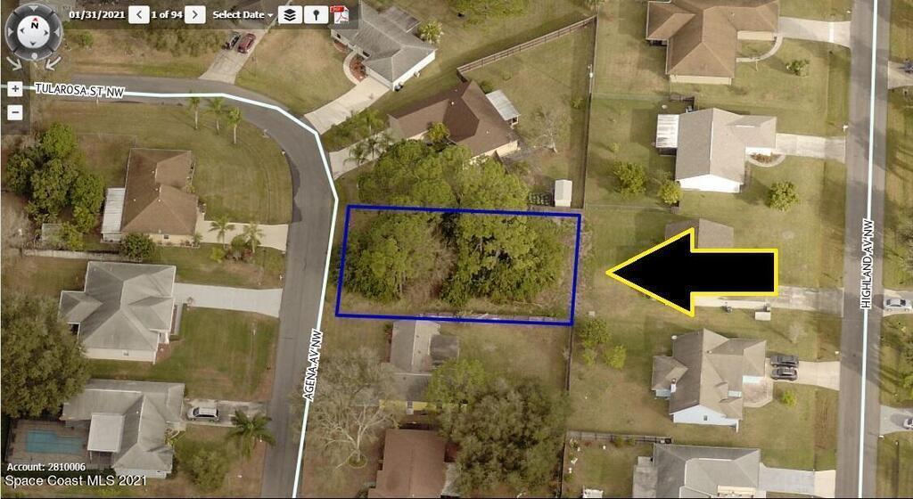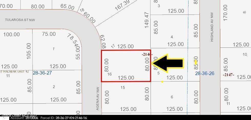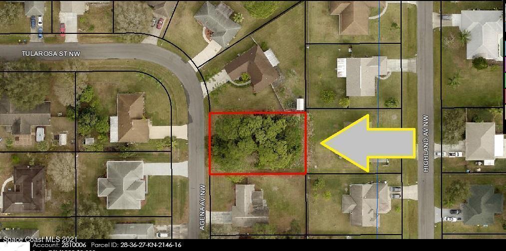 0.23 acre buildable residential lot available in Port Malabar Unit 42 of Palm Bay. Located in the northwest section, this lot has city water available, and is just 3.4 miles - 8 minutes to the Winn Dixie Supermarket, 3.5 miles - 8 minutes to McAuliffe Elementary School, 10.7 miles - 23 minutes to Melbourne Airport, and 13.3 miles - 29 minutes to the beaches of Indialantic. From exit #180 of I-95 go west on US-192 for .5 miles, left on St Johns Heritage Parkway for 4.8 miles, left on Pace Drive NW for 1.9 miles, right on Waikiki Avenue for .1 mile, left on Tularosa Street for .1, road turns right and becomes Agena Avenue. The lot will be on your left.