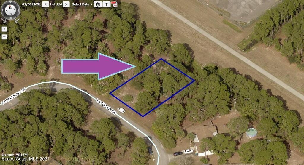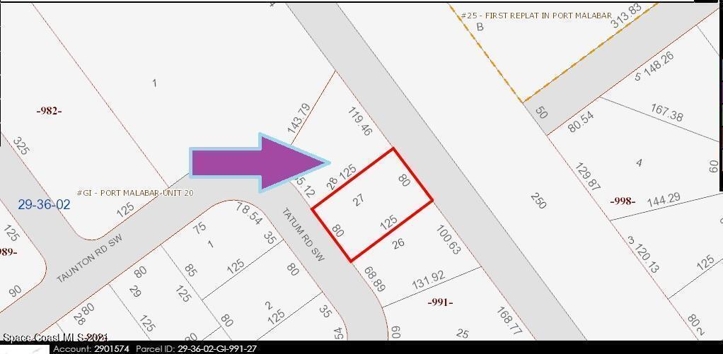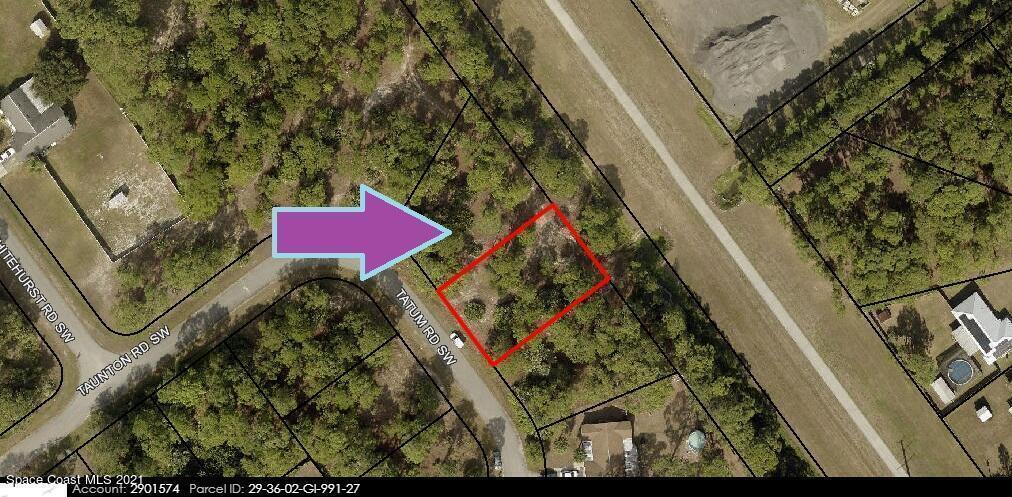 Standard sized 0.23 acre buildable single family residential lot with a drainage right-of-way easement canal in the back for more privacy available in Port Malabar Unit #20 of Palm Bay. Located in the southwest section, this property is just 1.2 miles - 4 minutes to Jupiter Elementary School, 2.3 miles - 6 minutes to the Winn Dixie Supermarket, 11.9 miles - 24 minutes to Melbourne Airport, and 14.5 miles - 27 minutes to the beaches of Indialantic. From exit #180 of I-95 go west on US-192W for .5 miles, left on St Johns Heritage Parkway for 6.1 miles, left on Malabar Road for 2.0 miles, right on Watoga Avenue SW for .1 mile, left on Whitehurst Road SW for .3 miles, left on Taunton Road which turns right and becomes Tatum. The lot will be on your left.