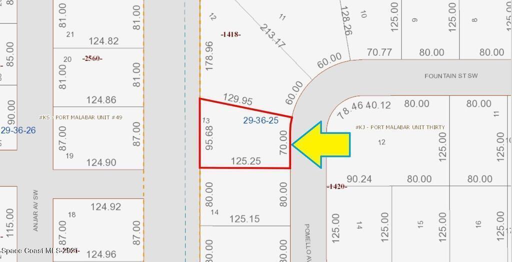 0.24 acre buildable single family residential lot -Rs2 zoning- with a drainage right-of-way easement canal in the back available in Port Malabar Unit #30. Nicely located in the SW Section near the famous Compound Area, this property is just 5 miles -11 minutes- to Publix Shopping, 3.6 miles -7 minutes- to Bayside High and Westside Elementary Schools, 9 miles -17 minutes to the Shoppes of Palm Bay, and just 18.2 miles -37 minutes- to the beaches in Indiatlantic. From Exit #173 of I-95 go west on Malabar Road SE. Turn left on San Filippo Drive SE and proceed south for 7.5 miles. Turn left on St. Andre Boulevard and proceed south for 0.9 miles. Turn right on Pomello Avenue SW and the lot will be on the left.