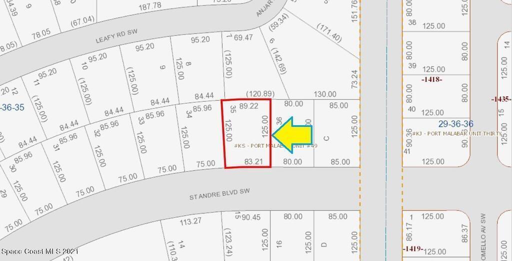 One of 2 side-by-side adjacent lots available in Port Malabar Unit 49 of Palm Bay (the other is 641 St. Andre). Located in the southwest section, this buildable residential lot is just 2.7 miles - 5 minutes to Westside Elementary School, 4.6 miles - 9 minutes to the Publix Supermarket, 15.9 miles - 33 minutes to Melbourne Airport, and 20.6 miles - 35 minutes to the beaches of Indialantic. From exit #173 of I-95 go west on Malabar Road for .2 miles, left on San Filippo Drive SE for 7.5 miles, and left on St. Andre Boulevard for .9 miles. The lot will be on your right. Both lots to be sold together.