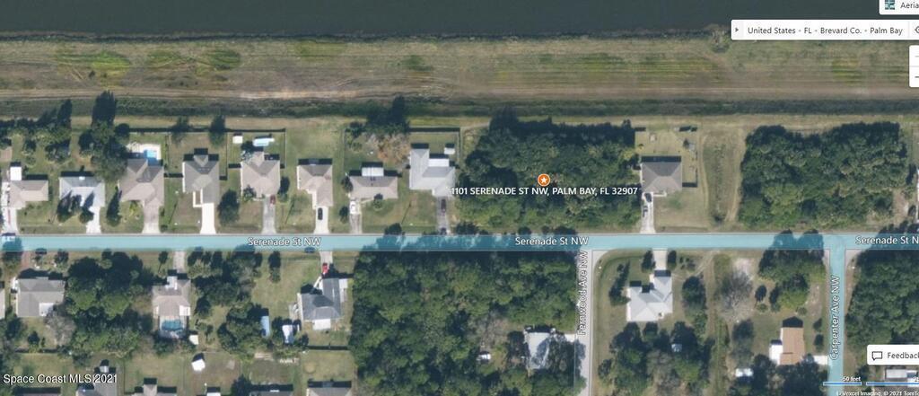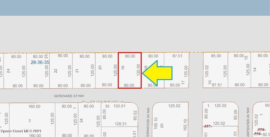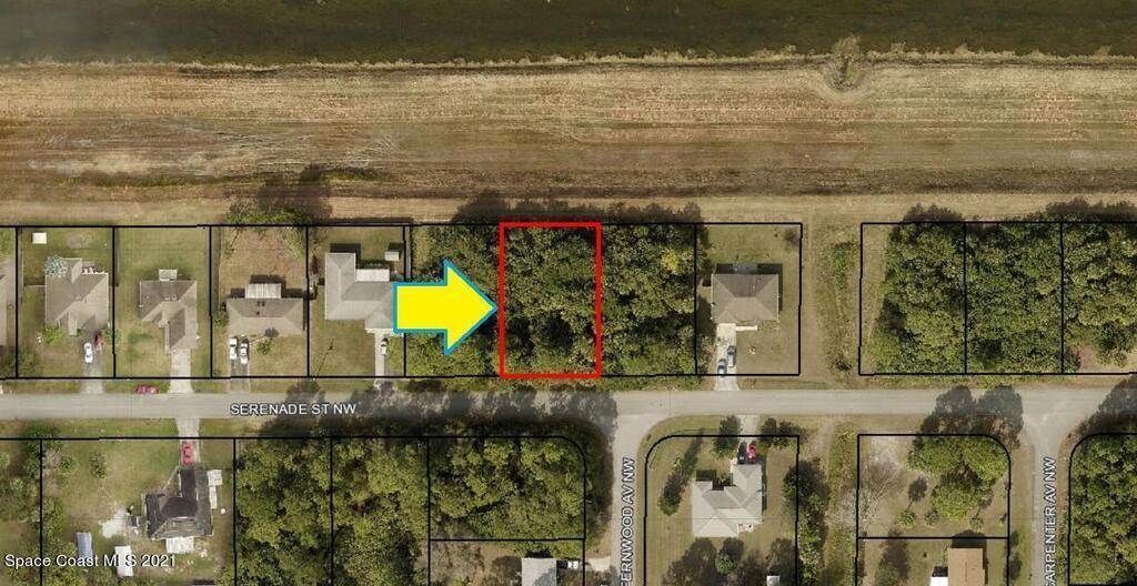 0.23 acre buildable residential lot available in Port Malabar Unit 14 of Palm Bay. Located in the northwest section, this lot has a drainage canal in the rear allowing more privacy, and is just 2.4 miles - 6 minutes to McAuliffe Elementary School, 2.7 miles - 7 minutes to the Winn Dixie Supermarket, 10.6 miles - 23 minutes to Melbourne Airport, and 13.2 miles - 29 minutes to the beaches of Indialantic. From exit #176 of I-95 go west on Palm Bay Road NE for .7 miles, left on Minton Road for .2 miles, right on Emerson Drive for 1.5 miles, left on Jupiter Boulevard for 1.3 miles, and right on Serenade Street. The lot will be on your right. Owner financing available with $10K down, @ 6.875% for up to 3 years.