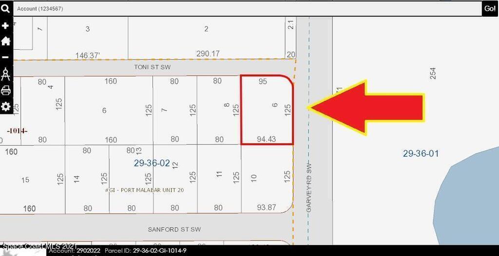 1 of 2 back to back adjacent single family residential [[ Corner ]] lots [Rs2 Zoning] available in Port Malabar Unit #20. Nicely located in the SW Section of Palm Bay these lots are just 4.1 miles -11 minutes- to Publix Shopping, 2.3 miles -6 minutes- to SouthWest Middle School, 3.3 miles -7 minutes- to the Shoppes of Palm Bay, and just 13.4 miles -32 minutes to the beaches in Indiatlantic. From Exit #176 of I-95 go west on Palm Bay Road NE. Turn left on Minton Road and proceed south for 2.5 miles. Turn right on Malabar Road and head west for 1 miles. Turn left on Garvey Road and the lot is on the corner of Garvey and Toni on the left side of the road. The buyer would like to sell both lots together but will consider separate sales. The other lot is on 601 Sanford.
