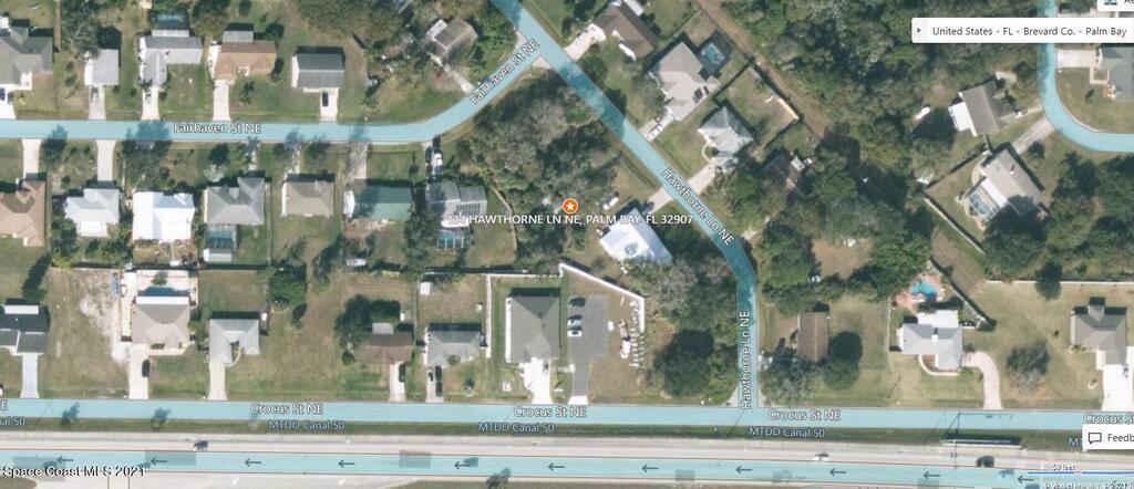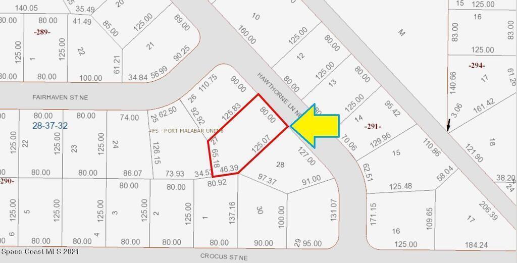 One of 2 side-by-side adjacent lots available in Port Malabar Unit 8 of Palm Bay (the other is 132 Hawthorne). Located in the northeast section, this 0.27 acre buildable residential lot has city water available, and is just .6 miles - 4 minutes to the Publix Supermarket, 2,7 miles - 6 minutes to Lockmar Elementary School, 9.9 miles - 22 minutes to Melbourne Airport, and 13.4 miles - 26 minutes to the beaches of Indialantic. From exit #173 of I-95 go west on Malabar Road for .5 miles, right on Eureka Avenue for .1 mile, left on Crocus Street for .2 miles, and right on Hawthorne Lane. The lot will be on your left.