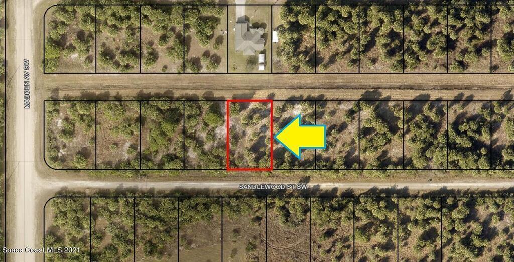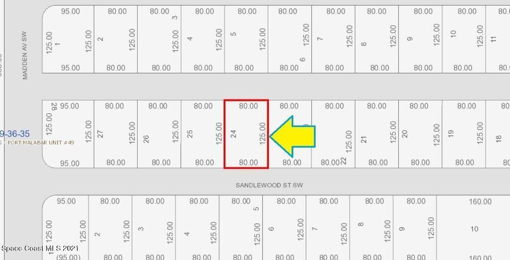 0.23 acre buildable residential lot available in Port Malabar Unit 49 of Palm Bay. Located in the southwest section, this lot has a drainage canal in the rear allowing more privacy, and is just 3.1 miles - 6 minutes to Westside Elementary School, 5.1 miles - 10 minutes to the Publix Supermarket, 16.3 miles - 33 minutes to Melbourne Airport, and 18.3 miles - 37 minutes to the beaches of Indialantic. From exit #176 of I-95 go west on Palm Bay Road for .7 miles, left on Minton Road for 3.3 miles, right on Jupiter Boulevard for .1 mile, left on DeGroodt Road for 4.6 miles, right on St. Andre Boulevard for 1.2 miles, left on Madden Road for .2 miles, and left on Sandlewood Street. The lot will be on your left.