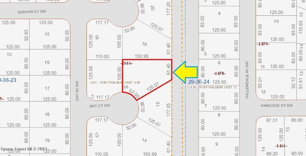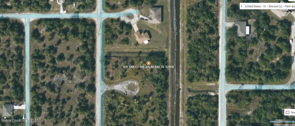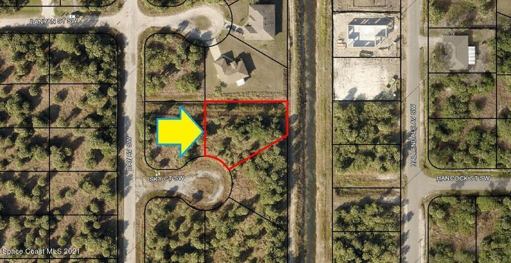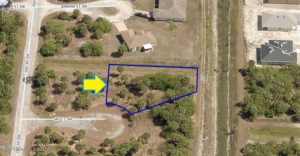 0.31 acre buildable residential lot available in Port Malabar Unit 49 of Palm Bay. Located in the southwest section, this lot is on a cul-de-sac, has a drainage canal in the rear allowing more privacy, and is just 1.1 miles - 3 minutes to Bayside High School, 2.3 miles - 6 minutes to the Publix Supermarket, 13.8 miles - 29 minutes to Melbourne Airport, and 16.8 miles - 35 minutes to the beaches of Indialantic. From exit #176 of I-95 go west on Palm Bay Road for .7 miles, left on Minton Road for 3.3 miles, right on Jupiter Boulevard for .1 mile, left on DeGroodt Road for 2.5 miles, right on J.A. Bombardier Boulevard for .7 miles, left on Day Avenue for .1 mile, and left on Sky Court. The lot will be at the end of the cul-de-sac.