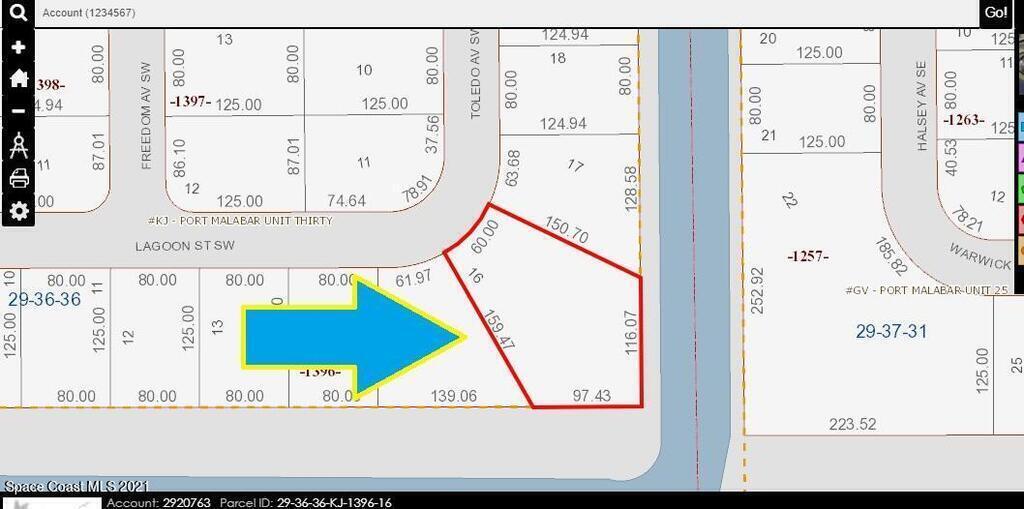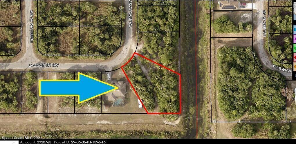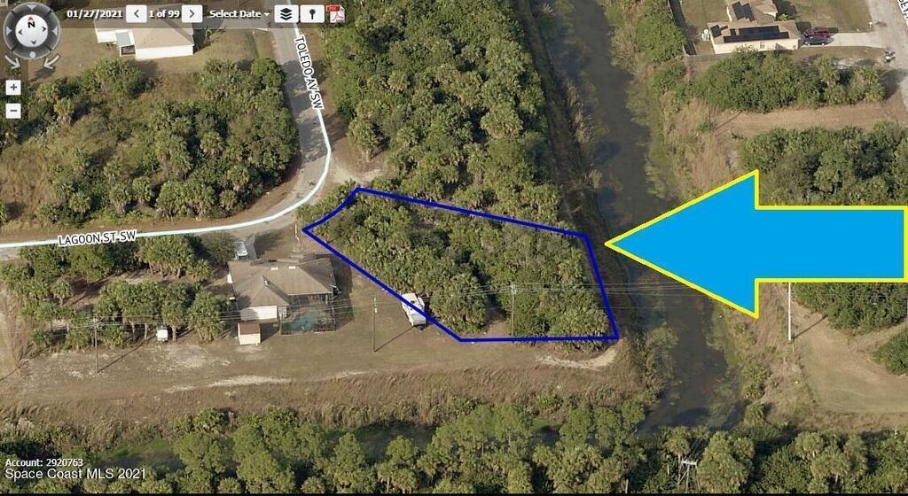 Oversized 0.37 acre buildable single family residential lot on a large drainage right-of-way easement canal in the back of the property located in Port Malabar Unit #30. Nicely located in the rural SW Section of Palm Bay, this lot is just 4.7 miles -11 minutes- to Publix Shopping, 3.3 miles -8 minutes- to Bayside High and WestSide Elementary Schools, 8.3 miles -18 minutes- to the Shoppes of Palm Bay, and just 17.6 miles -40 minutes- to the beaches and ocean at Indialantic. From Exit #173 of I-95 go west on Malabar Road. Turn left on San Filippo Drive SE and proceed south for 7.3 miles. Continue on DeGroodt Road and turn left on Cambria Avenue SW which becomes Lamarque Street. Turn left on Fox Avenue, Left on Ferguson Street and right on Toledo Avenue. The lot will be on the curve.
