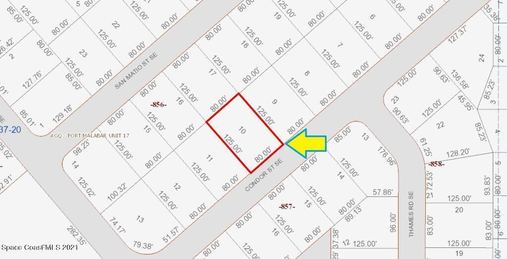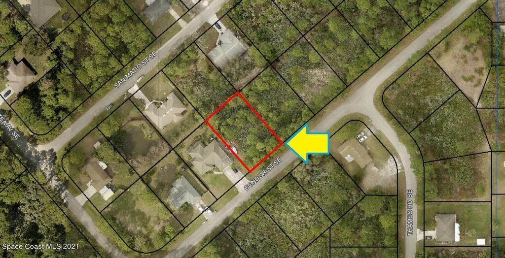 0.23 acre buildable residential lot available in Port Malabar Unit 17 of Palm Bay. Located in the southeast section, this lot is just 2.3 miles - 6 minutes to the Publix Supermarket, 2.7 miles - 7 minutes to Columbia Elementary School, 12.1 miles - 29 minutes to Melbourne Airport, and 14 miles - 32 minutes to the beaches of Indialantic. From exit #173 of I-95 go west on Malabar Road for .2 miles, left on San Filippo Drive for 3.3 miles, right on Wyoming Drive for .7 miles, left on Warrior Avenue for .2 miles, right on San Matio Street for .2 miles, left on Rockabye Avenue for .1 mile, and right on Condor Street. The lot will be on your right.