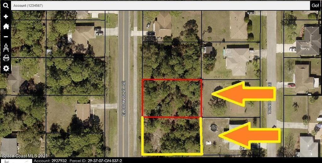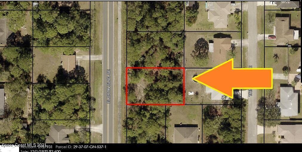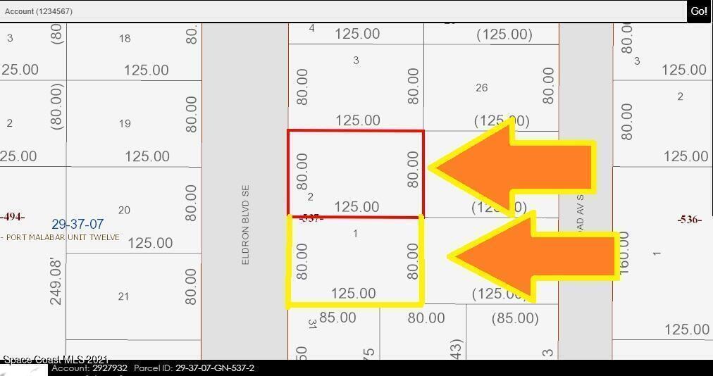 2 of 2 side by side adjacent city water available lots with sidewalks available in Port Malabar Unit #12 of Palm Bay. Nicely located on Eldron Boulevard with RS2 Zoning, this lot is just 2 miles -5 minutes- to Publix Shopping, 3.5 miles - 7 minutes- to Bayside High and WestSide Elementary Schools, 3 miles -7 minutes- to the Shoppes of Palm Bay, and just 13 miles -30 minutes- to the beaches in Indialantic. From Exit #173 of I-95 go west on Malabar Road. Turn left on San Filippo Drive SE, right on Jupiter Boulevard SE and turn left on Eldron Boulevard SE, Proceed 0.6 miles to 885 and 877 Eldron Boulevard Se, Palm Bay. The lots are on the left.