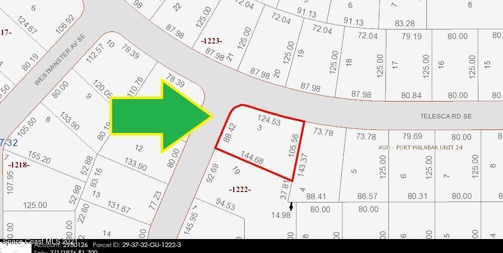 Oversize 0.31 acre corner single family residential buildable lot [Rs2 Zoning] available in Port Malabar Unit #24 of Palm Bay. Nicely located in the SE Section near the Bayside Lakes Subdivision and the PGA Majors Golf Course, this lot is just 3.7 miles -8 minutes- to Publix Shopping, 5 miles -10 minutes- to Bayside High and WestSide Elementary Schools, 6.8 miles -15 minutes- to the Shoppes of Palm Bay, and just 16.2 miles -35 minutes- to the beaches in Indialantic. From Exit #173 of I-95 to west on Malabar Road SE. Turn left on San Filippo Drive SE and proceed south for 5.7 miles. Turn left on Cogan Drive, right on Sarasota Drive and left on Telesca Road. The corner lot will be on Telesca and Westchester.