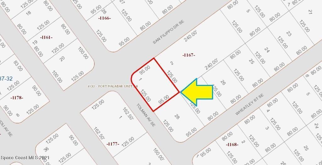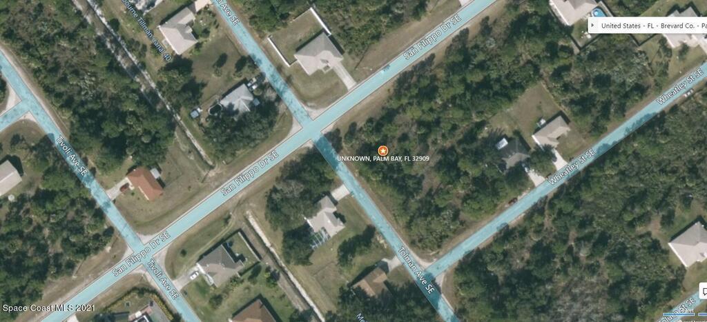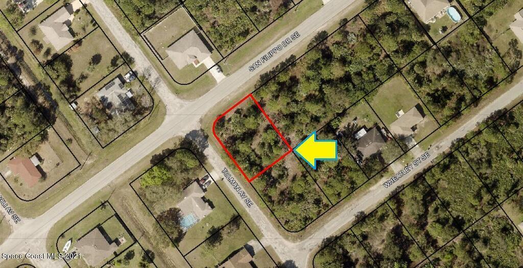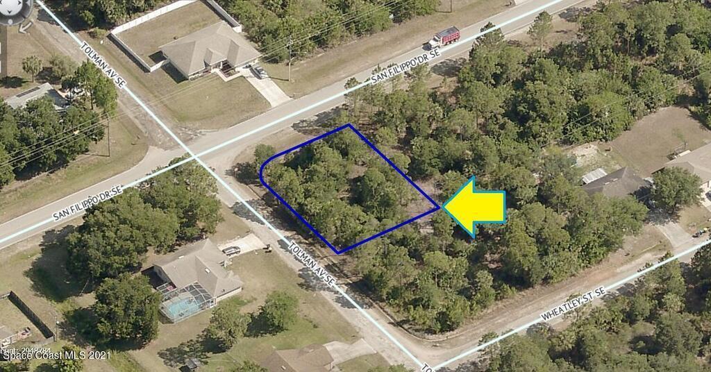 0.27 acre buildable residential Corner lot available in Port Malabar Unit 24 of Palm Bay. Located in the southeast section, this lot is just 2.9 miles - 6 minutes to the Publix Supermarket, 3.3 miles - 7 minutes to Sunrise Elementary School, 13.4 miles - 30 minutes to Melbourne Airport, and 18.1 miles - 31 minutes to the beaches of Indialantic. From exit #173 of I-95 go west on Malabar Road for .2 miles, left on San Filippo Drive for 5.9 miles. The lot will be on your left at the corner with Tolman Avenue.