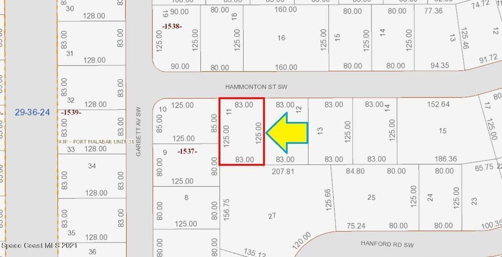 One of 2 side-by-side adjacent lots available in Port Malabar Unit 31 of Palm Bay (the other is 378 Hammonton). Located in the southwest section, this 0.24 acre buildable residential lot has city water available, and is just .4 miles - 2 minutes to Westside Elementary School, 2 miles - 5 minutes to the Publix Supermarket, 13.5 miles - 29 minutes to Melbourne Airport, and 16.1 miles - 34 minutes to the beaches of Indialantic. From exit #176 of I-95 go west on Palm Bay Road for .7 miles, left on Minton Road for 3.3 miles, right on Jupiter Boulevard for .1 mile, left on DeGroodt Road for 2.9 miles, and right on Hammonton Street. The lot will be on your left.