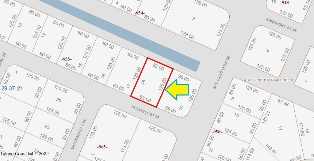 0.24 acre buildable residential lot available in Port Malabar Unit 18 of Palm Bay. Located in the southeast section, this lot has a drainage canal in the rear allowing more privacy, and is just 2 miles - 4 minutes to Columbia Elementary School, 3 miles - 7 minutes to the Publix Supermarket, 11.4 miles - 25 minutes to Melbourne Airport, and 13.4 miles - 28 minutes to the beaches of Indialantic. From exit #173 of I-95 go west on Malabar Road for .2 miles, left on San Filippo Drive for 4.0 miles, and right on Tidewell Street. The lot will be on your right.