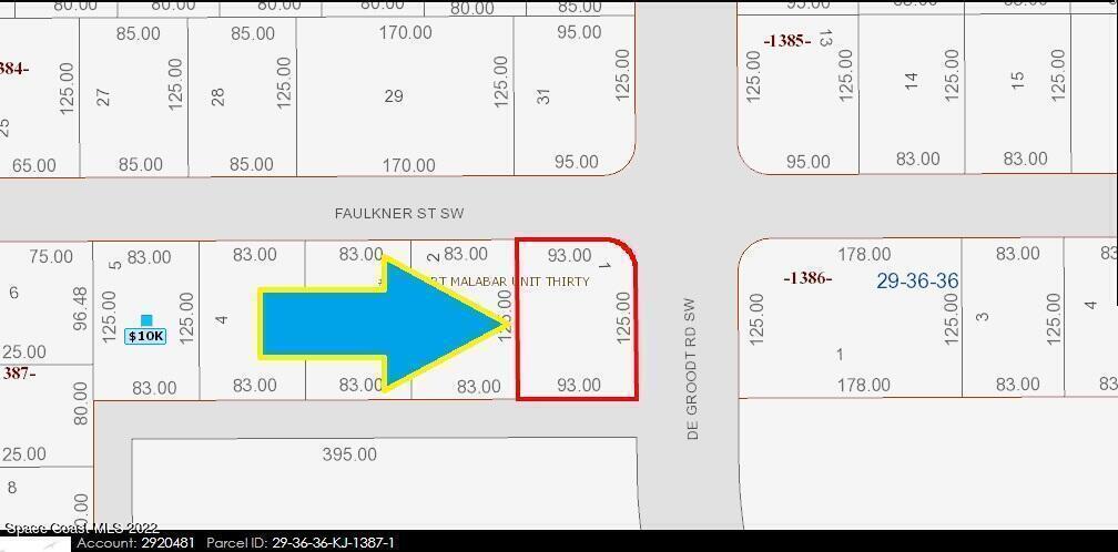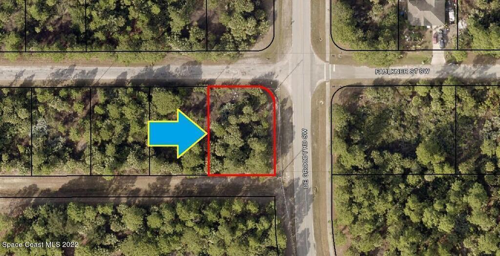 Oversized 0.27 acre [Corner] buildable single family residential lot available in Port Malabar Unit #30 of Palm Bay. Nicely located in the rural SW Section, this lot is just 2.2 miles -4 minutes- to Bayside High and Westside Elementary Schools, 3.6 miles -7 minutes- to Publix Shopping, 12.4 miles -24 minutes to the Melbourne Square and just 17.0 miles -32 minutes- to the beaches in Indialantic. From Exit #176 of I-95 go west on Palm Bay Road NE. turn left on MInton Road and proceed south for 3.3 miles. Turn right on Jupiter Boulevard SW and left on DeGroodt Road SW. Proceed south for 4.5 miles and the lot is on your right.