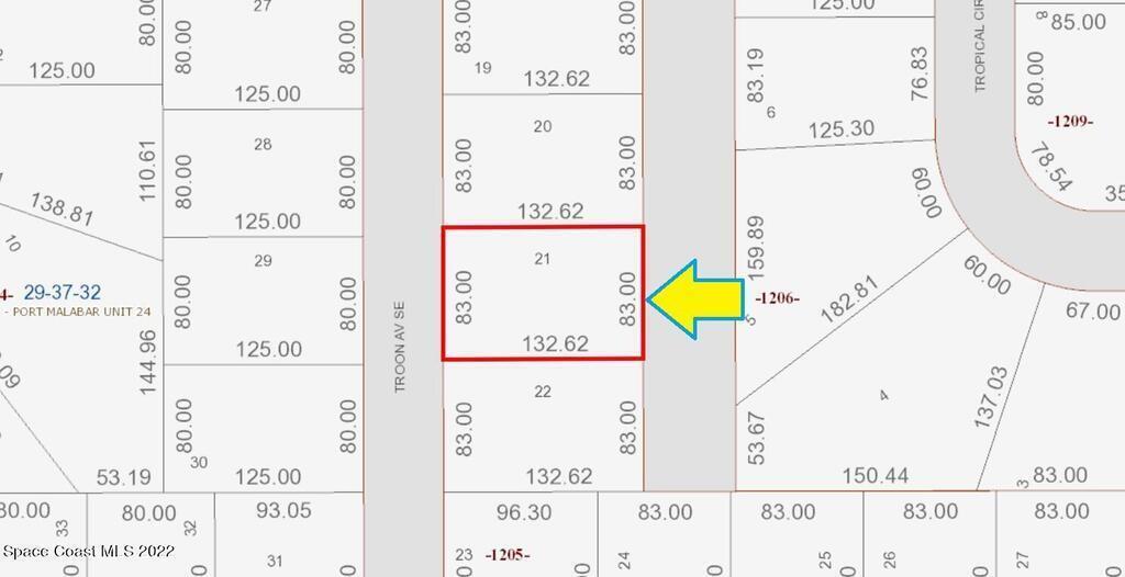 0.24 acre buildable residential lot available in Port Malabar Unit 24 of Palm Bay. Located in the southeast section, this lot has a drainage canal in the rear allowing more privacy, and is just 2.7 miles - 6 minutes to Sunrise Elementary School, 3.9 miles - 8 minutes to the Publix Supermarket, 14.6 miles - 29 minutes to Melbourne Airport, and 16.5 miles - 32 minutes to the beaches of Indialantic. From exit #173 of I-95 go west on Malabar Road for .2 miles, left on San Filippo Drive for 5.7 miles, left on Cogan Drive for .8 miles, right on Sarasota Drive for .4 miles, and right on Troon Avenue. The lot will be on your right.