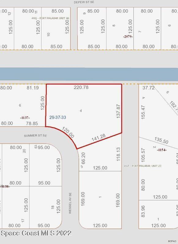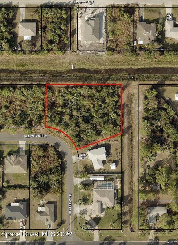 THIS JUMBO DOUBLE LOT PROVIDES .80 OF AN ACRE OF EXPANSIVE SPACE! PLEASANTLY SETTLED IN A QUIET NEIGHBORHOOD WITH PAVED ROADS, THE PARCEL BACKS UP TO A DRAINAGE CANAL, OFFERING EXTRA PRIVACY FROM BACK-DOOR NEIGHBORS! THE COUNTY'S NEW I-95 INTERCHANGE IS JUST 3 MINUTES AWAY AND ALL LOCAL SCHOOLS ARE WITHIN A 4 TO 13-MINUTE COMMUTE. THE BAYSIDE LAKES DISTRICT IS A SHORT 8-MINUTE TRIP, OFFERING A PUBLIX, DUNKIN', TASTY EATERIES, AND OTHER EVERYDAY COMFORTS. THE MAJORS GOLF CLUB IS A GREAT PLACE FOR ACTIVE FUN IN THE SUN. A 14-MINUTE DRIVE NORTH TAKES YOU TO THE MALABAR ROAD CORRIDOR LINED WITH A HOST OF STORES, RESTAURANTS, AND SERVICES. THIS SITE UTILIZES WELL WATER AND SEPTIC.