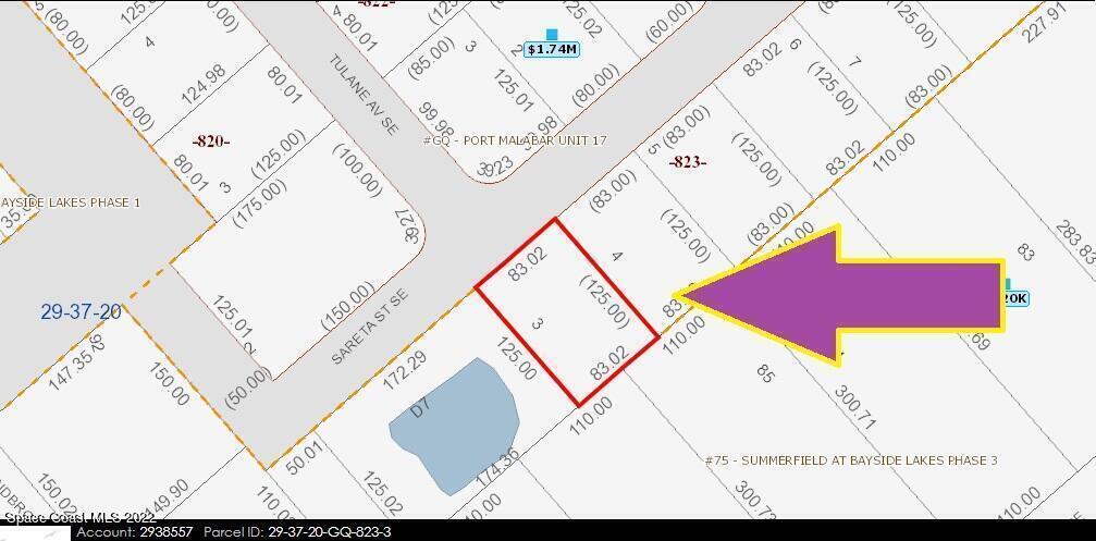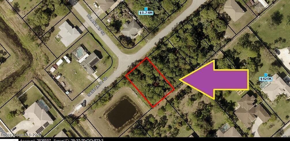 0.24 acre buildable single family residential lot on a dead end street available in Port Malabar Unit #17 of Palm Bay. Located in the southeast section, this lot is just 1.8 miles - 6 minutes to the Publix Supermarket, 2.4 miles - 6 minutes to Columbia Elementary School, 12.1 miles - 30 minutes to Melbourne Airport, and 12.1 miles - 30 minutes to the beaches of Indialantic. From exit #173 of I-95 go west on Malabar Road for .2 miles, left on San Filippo Drive for 3.3 miles, right on Wyoming Drive for .9 miles, right on Pirate Avenue for .1 mile, left on Tetzel Street for .2 miles, road turns right becomes Thomasville, and left on Sareta Street. The lot will be on your left.