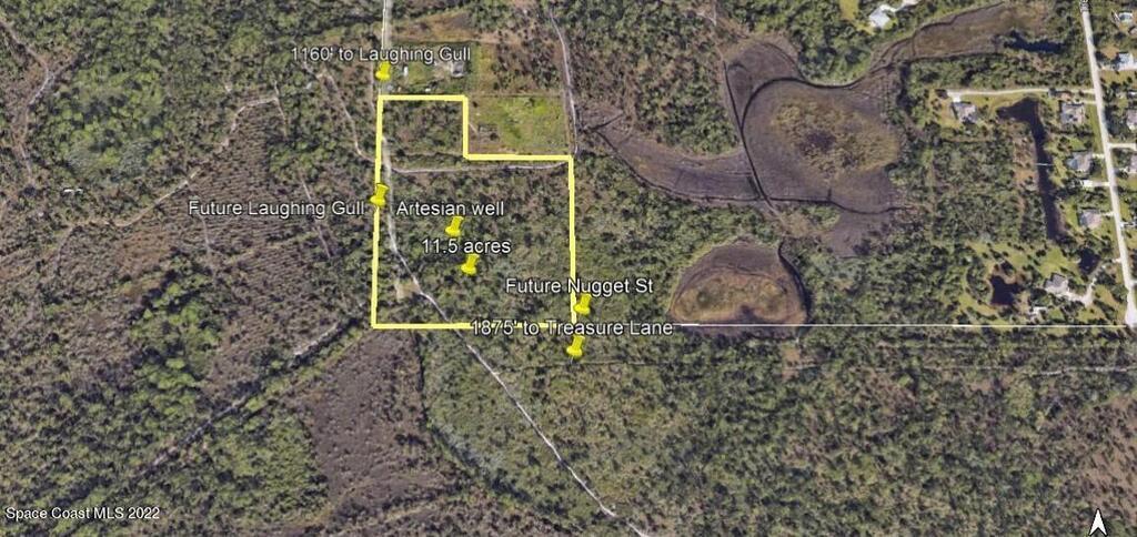 Gorgeous 11.5 acres of dry land (zone X) in desired Grant-Valkaria FL. Working artesian well Enjoy the country air and relaxation with nature. Located on the NE corner of 2 designated roadways, Nugget St and Laughing Gull Ave. Surveys on file. Parcels 2957991 & 2958071