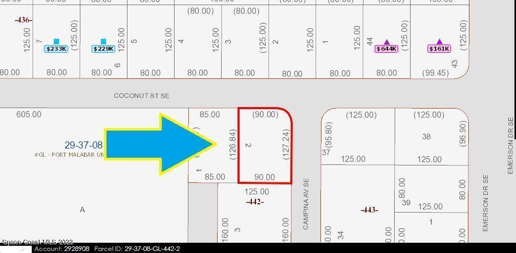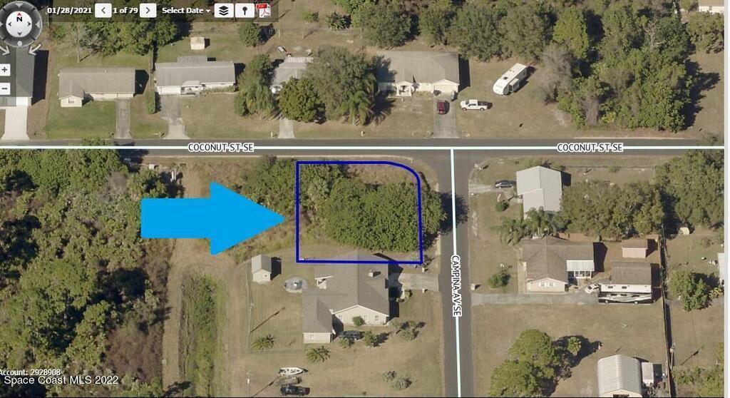 One of 2 side-by-side adjacent lots available in Port Malabar Unit 11 of Palm Bay (the other is 802 Coconut). Located in the southeast section, this buildable residential Corner lot has city water available, and is just 1 mile - 3 minutes to Turner Elementary School, 1.7 miles - 5 minutes to the Walmart Supercenter, 11.1 miles - 25 minutes to Melbourne Airport, and 14.6 miles - 29 minutes to the beaches of Indialantic. From exit #173 of I-95 go west on Malabar Road for .2 miles, left on San Filippo Drive for .5 miles, right on Jupiter Boulevard for .9 miles, left on Emerson Drive for .4 miles, and right on Coconut Street. The lot will be on your left on the corner with Campina Avenue.