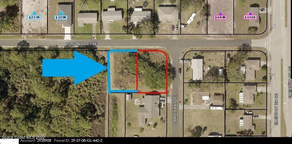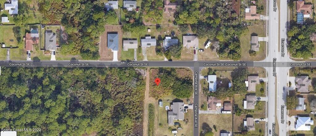 0.50 acre buildable residential lot available in Port Malabar Unit 11 of Palm Bay. Located in the southeast section, this buildable residential Corner lot has city water available, and is just 1 mile - 3 minutes to Turner Elementary School, 1.7 miles - 5 minutes to the Walmart Supercenter, 11.1 miles - 25 minutes to Melbourne Airport, and 14.6 miles - 29 minutes to the beaches of Indialantic. From exit #173 of I-95 go west on Malabar Road for .2 miles, left on San Filippo Drive for .5 miles, right on Jupiter Boulevard for .9 miles, left on Emerson Drive for .4 miles, and right on Coconut Street. The lot will be on your left on the corner with Campina Avenue.