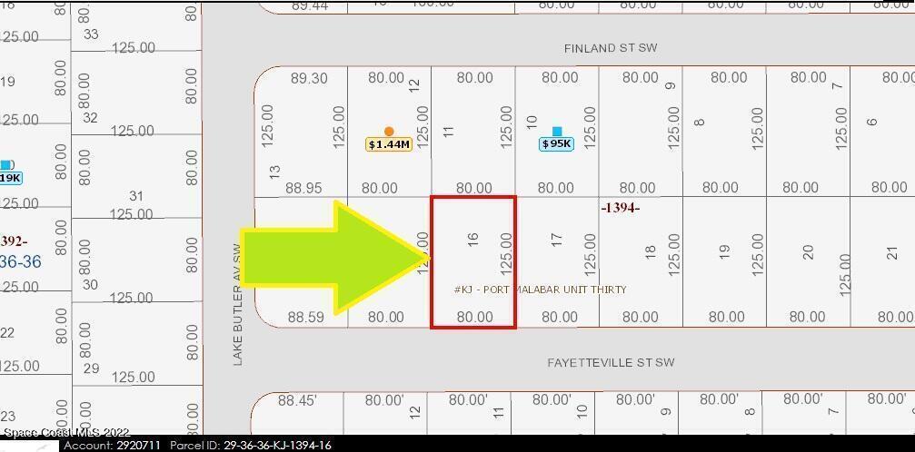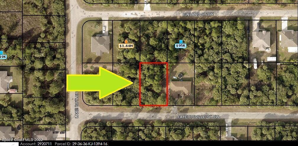 0.23 acre buildable residential lot available in Port Malabar Unit 30 of Palm Bay. Located in the southwest section, this lot is just 2.7 miles - 7 minutes to Westside Elementary School, 4.7 miles - 11 minutes to the Publix Supermarket, 15.5 miles - 33 minutes to Melbourne Airport, and 20 miles - 35 minutes to the beaches of Indialantic. From exit #176 of I-95 go west on Palm Bay Road for .7 miles, left on Minton Road for 3.3 miles, right on Jupiter Boulevard, left on DeGroodt Road for 4.6 miles, right on St Andre Boulevard for .2 miles, left on Framingham Avenue for .43 miles, left on Finkle Street, left on Butler Avenue, and right on Fayetteville Street. The lot will be on your left.