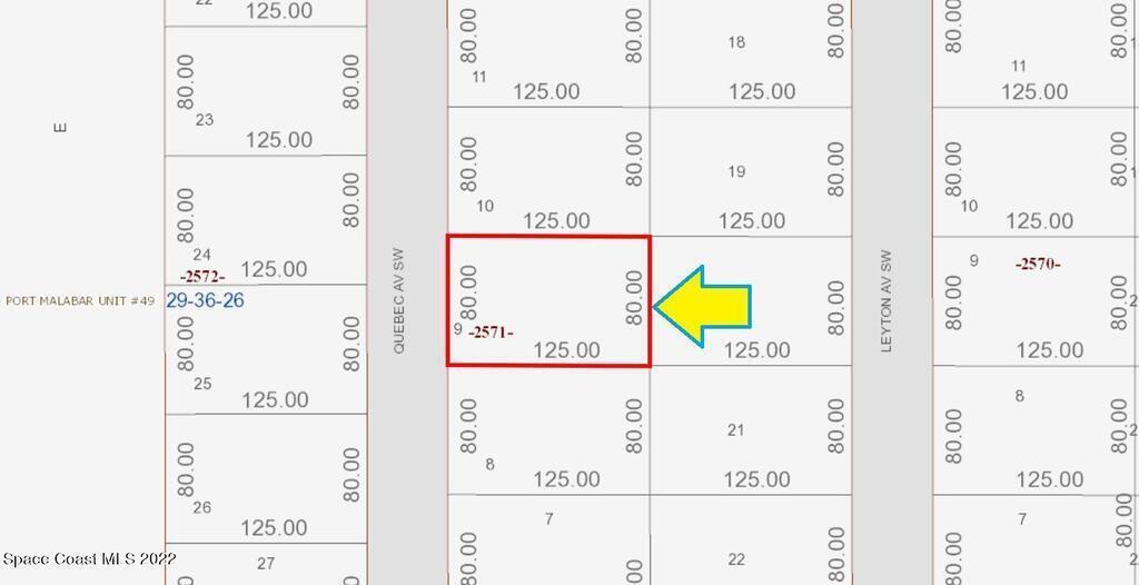 0.23 acre buildable residential lot available in Port Malabar Unit 49 of Palm Bay. Located in the southwest section, this lot is just 2.3 miles - 6 minutes to Westside Elementary School, 4.3 miles - 10 minutes to the Publix Supermarket, 15.6 miles - 34 minutes to Melbourne Airport, and 21.9 miles - 38 minutes to the beaches of Indialantic. From exit #176 of I-95 go west on Palm Bay Road for .7 miles, left on Minton Road tor 3.3 miles, right on Jupiter Boulevard, left on DeGroodt Road for 3.3 miles, right on Osmosis Drive for 1.0 mile, left on Madden Avenue for .7 miles, left on Hurricane Street, and right on Quebec Avenue. The lot will be on your left.