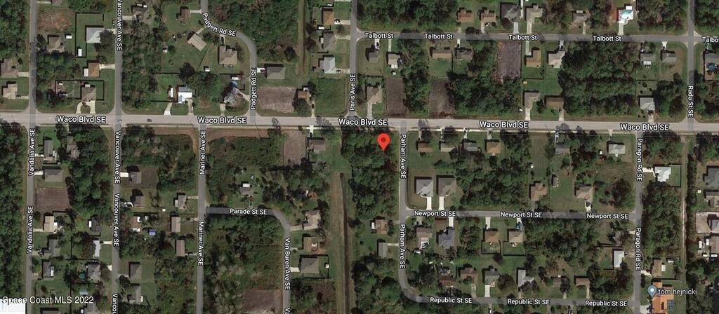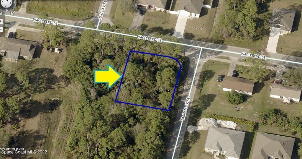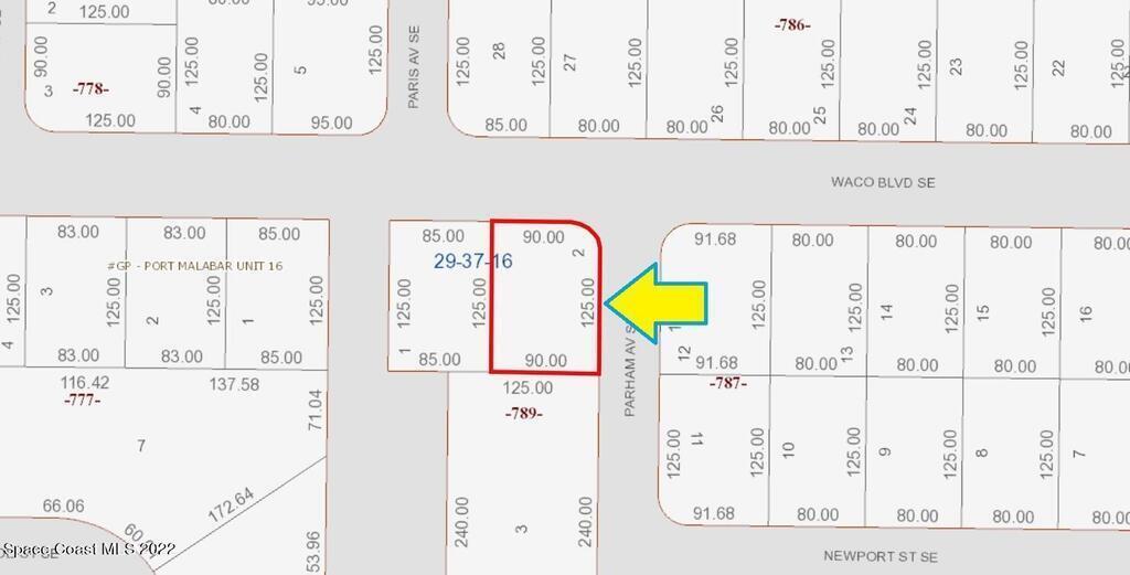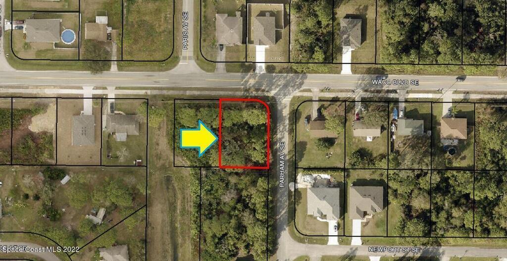One of 2 side-by-side adjacent lots available in Port Malabar Unit 16 of Palm Bay (the other is 1450 Waco). Located in the southeast section, this 0.26 acre buildable residential Corner lot has city water available, and is just .6 miles - 1 minute to Columbia Elementary School, 2.7 miles - 6 minutes to the Publix Supermarket, 10 miles - 21 minutes to Melbourne Airport, and 11.9 miles - 25 minutes to the beaches of Indialantic. From exit #173 of I-95 go west on Malabar Road for .2 miles, left on San Filippo Drive for 2.3 miles, and left on Waco Boulevard. The lot will be on your right at the corner with Parham Avenue.