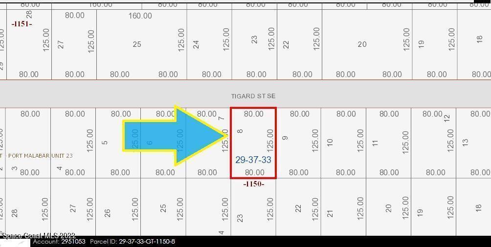 0.23 acre build-able single family residential lots available in Port Malabar Unit #23 of Palm Bay. Nicely located in the SE Section, this lot is just 6 miles -12 minutes- to Bayside High and Westside Elementary Schools, 4.6 miles -10 minutes- to Publix Shopping, 6.8 miles -13 minutes to the Shoppes of Palm Bay, 13.5 miles -28 minutes- to the Melbourne Square Mall, and just 15.4 miles -31 minutes- to the beaches in Indialantic. From Exit #173 of I-95 go east on Malabar Road SE. Turn right on Babcock Street and go right on Tigard Street. The lot will be on the left.